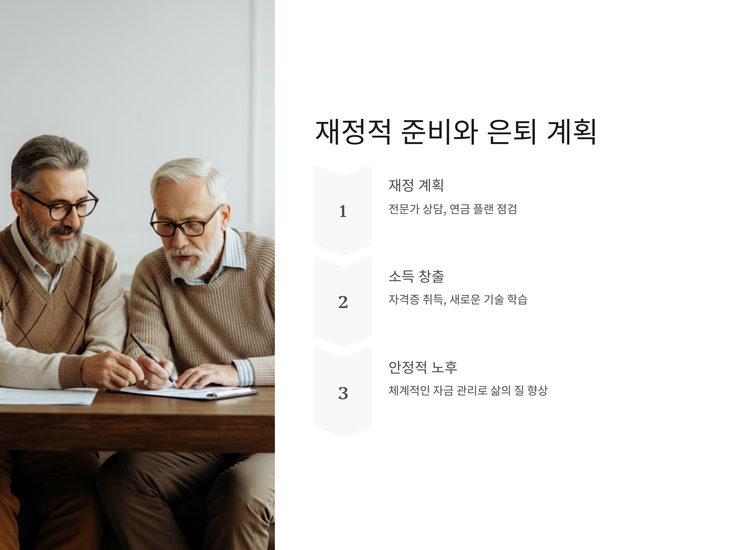 자격증 취득이나 새로운 기술 학습을 통해 은퇴 후에도 소득을 유지할 방법을 찾는 것이 중요합니다.