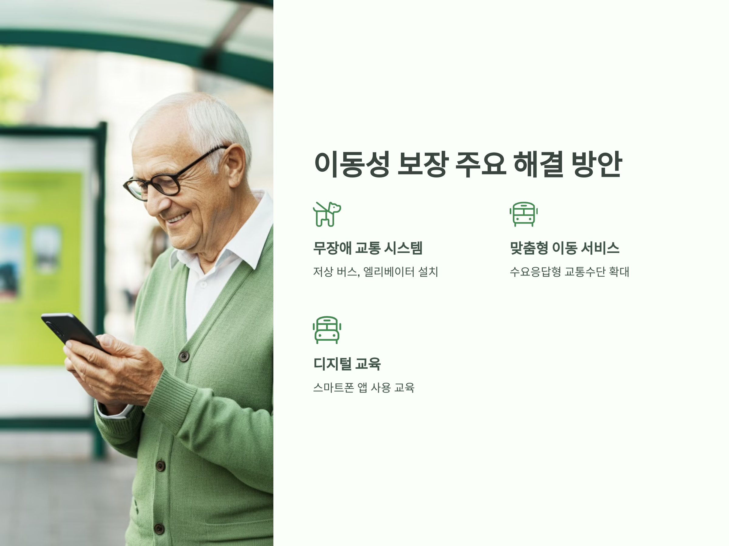 고령층의 이동성을 보장하기 위해서는 물리적 접근성, 기술적 편의성, 정책적 지원 등 다각적인 접근이 필요합니다.