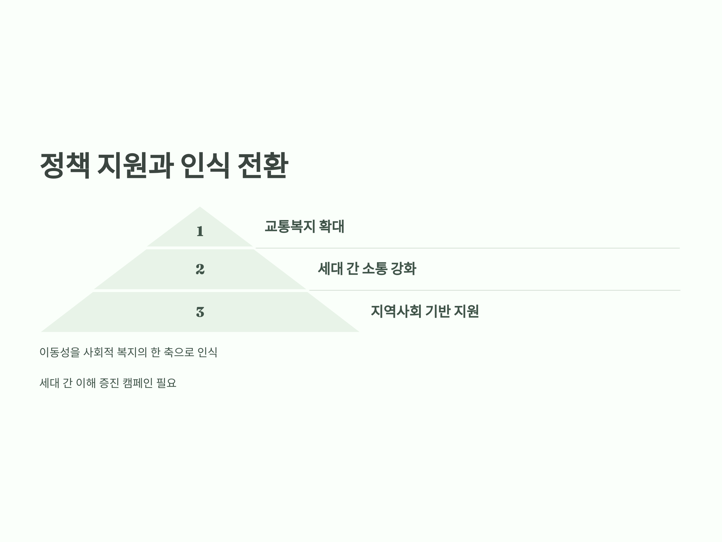 이동성을 사회적 복지의 한 축으로 인식하고, 예산을 우선적으로 배정해야 합니다. 이는 단순히 노인층만이 아니라 전 세대를 위한 사회적 투자로 간주되어야 합니다.
