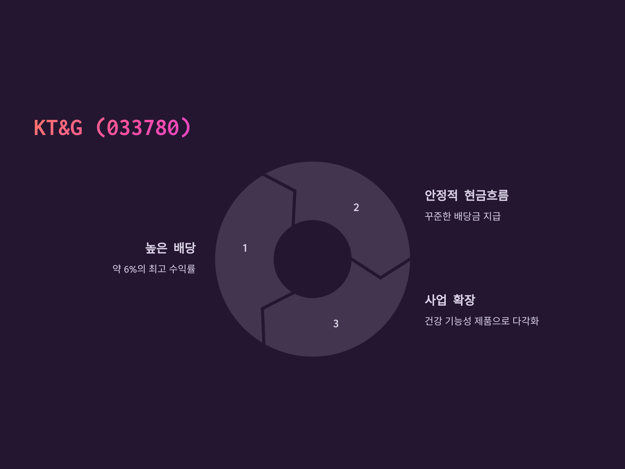 KT&G는 국내외 담배 시장에서 강력한 입지를 자랑하며, 최근에는 건강 기능성 제품 등 다각화된 사업을 통해 성장하고 있습니다. 안정적인 배당 외에도 이러한 사업 확장은 향후 긍정적인 영향을 미칠 수 있습니다.