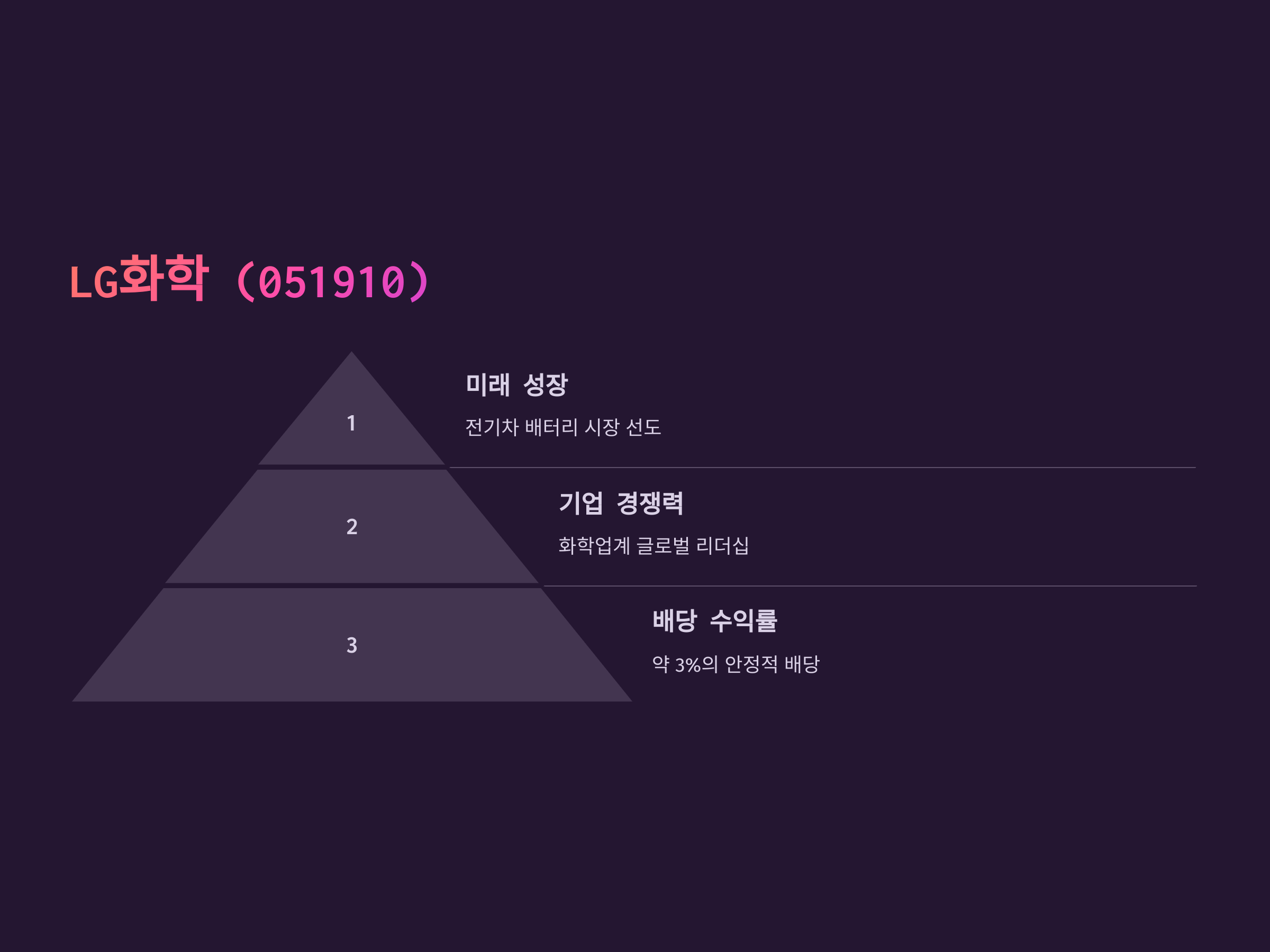 LG화학은 화학업계에서 오랜 역사를 자랑하는 글로벌 기업으로, 매년 안정적인 배당금을 지급하고 있습니다. 2025년 현재 배당 수익률은 약 3%이며, 회사는 지속적인 배당금 상승을 추구하고 있습니다. 특히, 전기차 배터리와 관련된 사업 부문에서 성장이 가속화되고 있어, 배당금 외에도 장기적인 주가 상승에 대한 기대감이 큽니다.