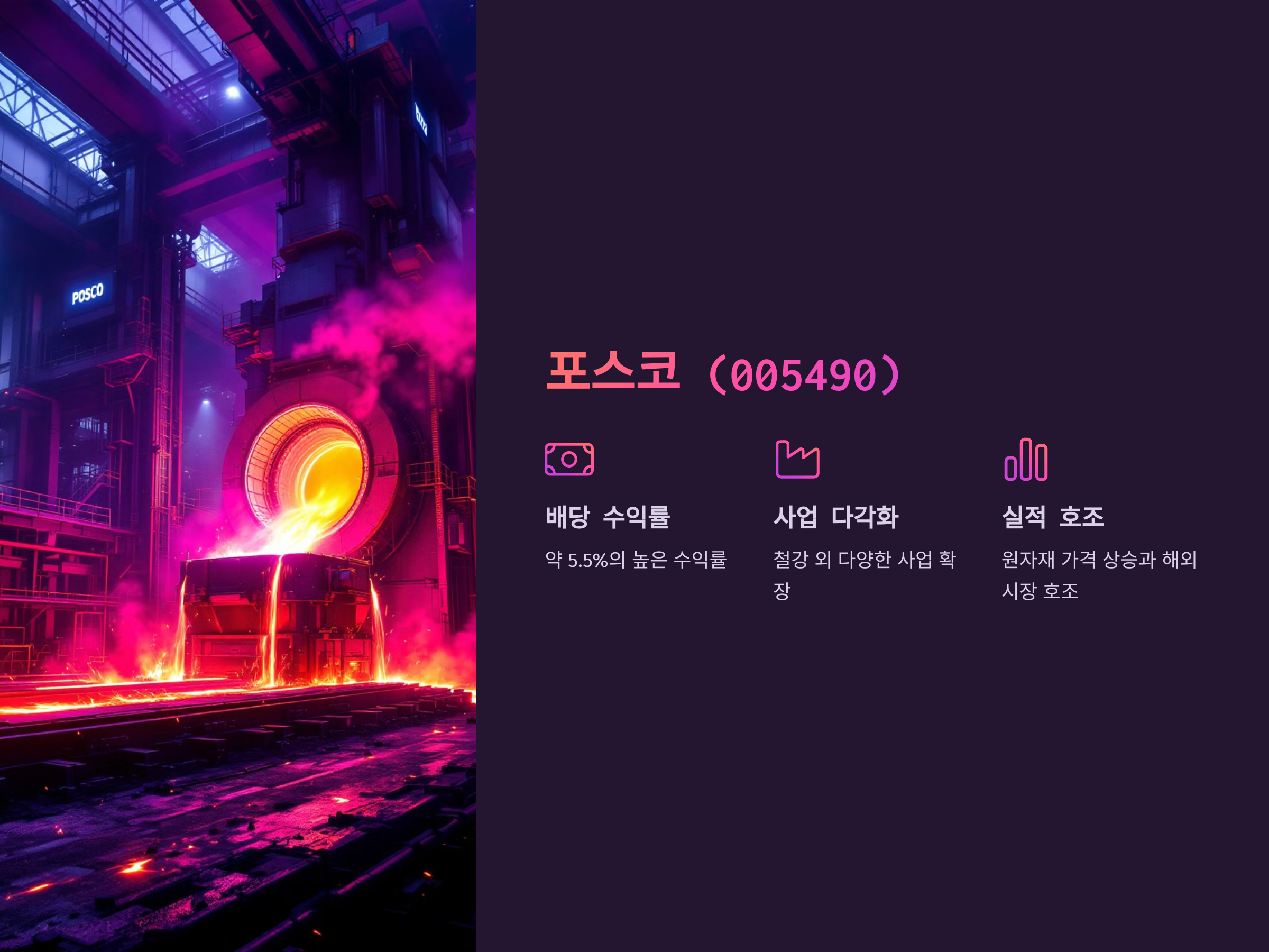 최근 원자재 가격 상승과 해외 시장에서의 호조로 인해 포스코는 좋은 실적을 기록하고 있으며, 이는 배당금 상승으로 이어질 가능성이 높습니다. 따라서 고배당주를 찾는 투자자들에게는 매우 매력적인 종목입니다.