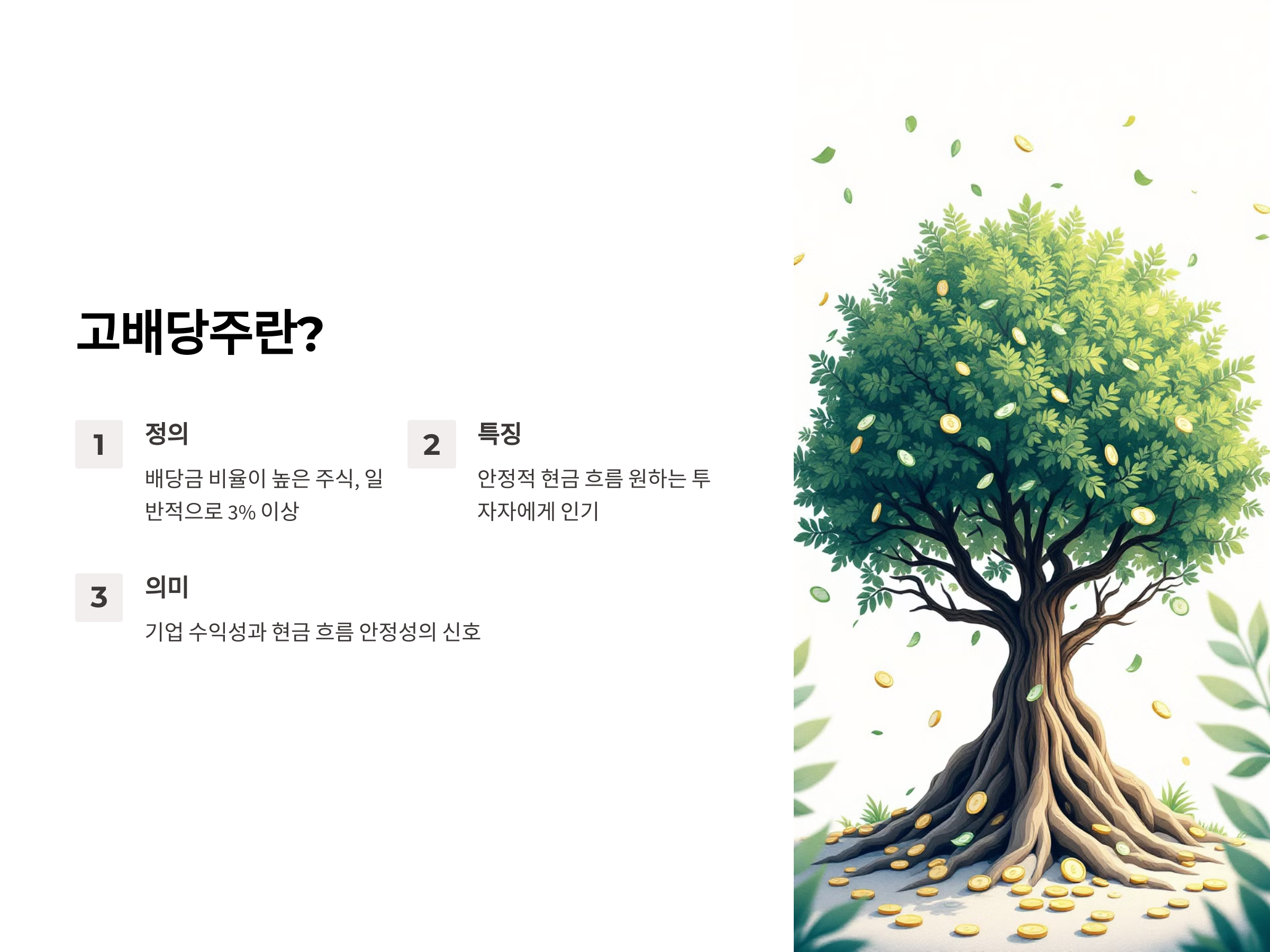 고배당주는 기업이 주주들에게 지급하는 배당금의 비율이 상대적으로 높은 주식을 의미합니다. 일반적으로 배당 수익률이 3% 이상인 주식을 고배당주로 분류합니다. 이러한 주식은 안정적인 현금 흐름을 원하는 투자자들에게 인기가 많습니다. 고배당주는 기업의 수익성과 현금 흐름이 안정적이라는 신호로 해석될 수 있으며, 이는 투자자들에게 신뢰를 줍니다.
