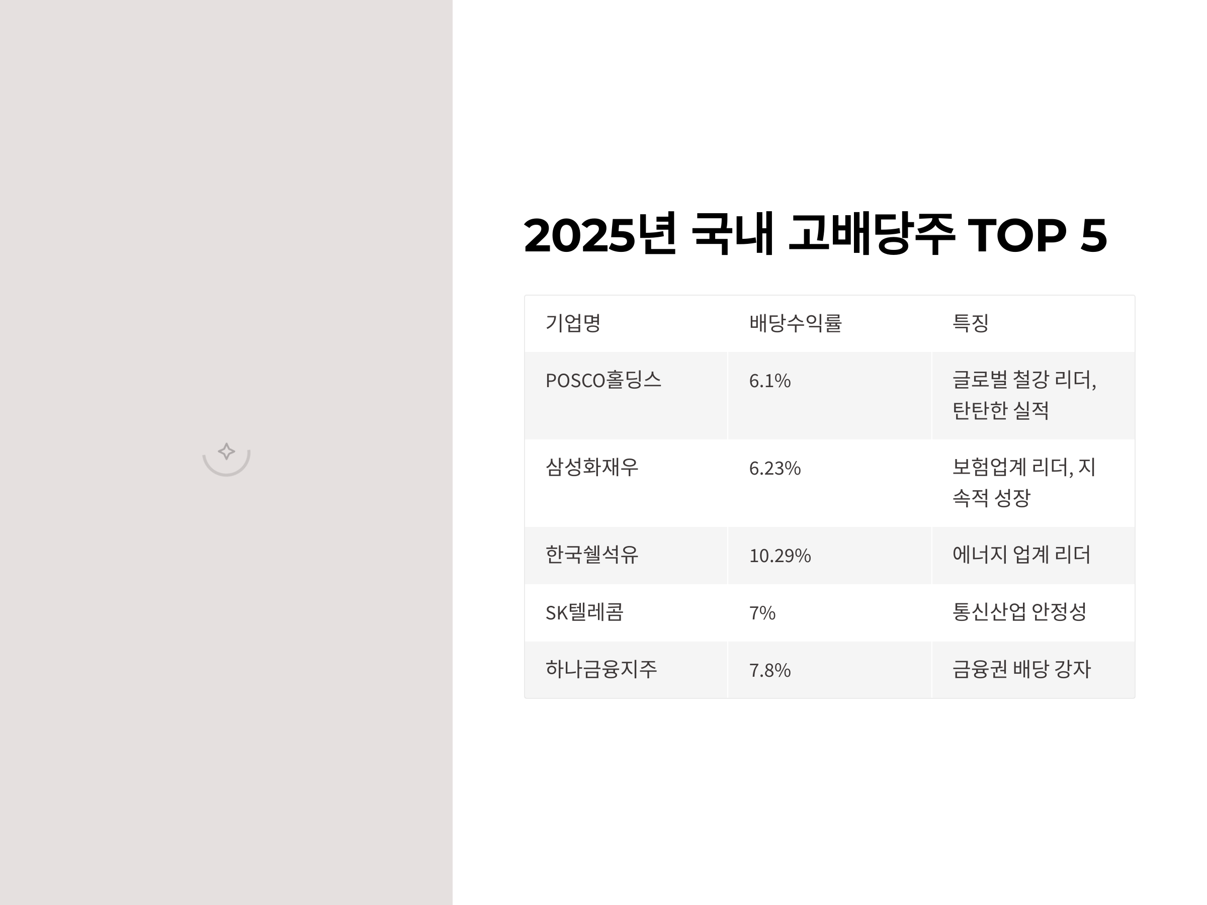 2025년에 주목할 만한 국내 고배당주 TOP 5를 소개합니다. 아래 종목들은 안정적인 배당 정책과 수익성을 바탕으로 선정되었습니다.