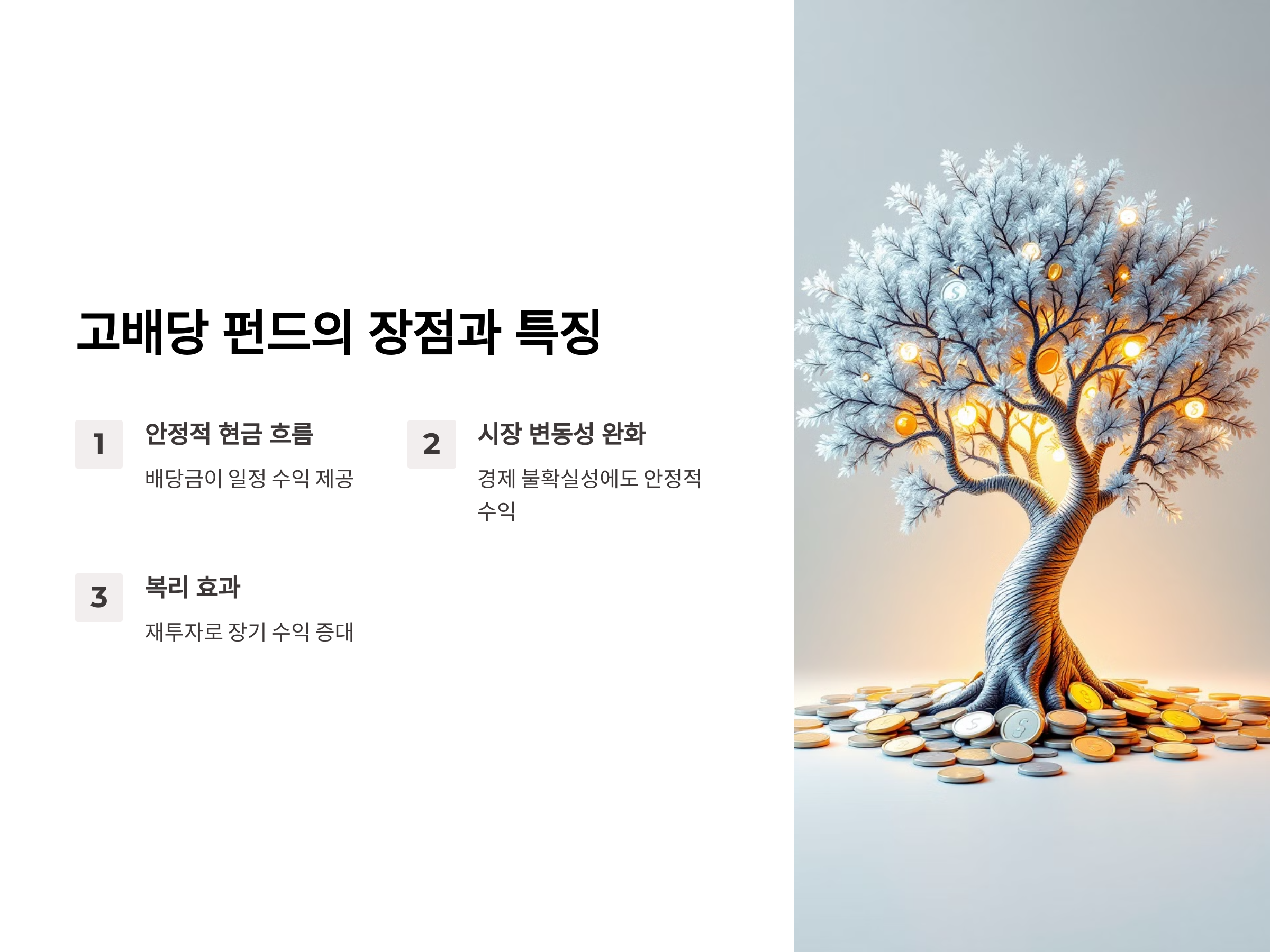 고배당 펀드는 안정적인 현금 흐름을 제공하고, 장기적인 수익을 추구하는 투자자에게 매우 유리한 투자 방법입니다. 높은 배당 수익률과 꾸준한 배당금 지급을 통해 불확실한 시장에서도 안정적인 수익을 얻을 수 있는 장점이 있습니다. 하지만, 배당금 지급의 불확실성과 시장 변동성 등을 고려할 때, 신중하게 펀드를 선택하는 것이 중요합니다.