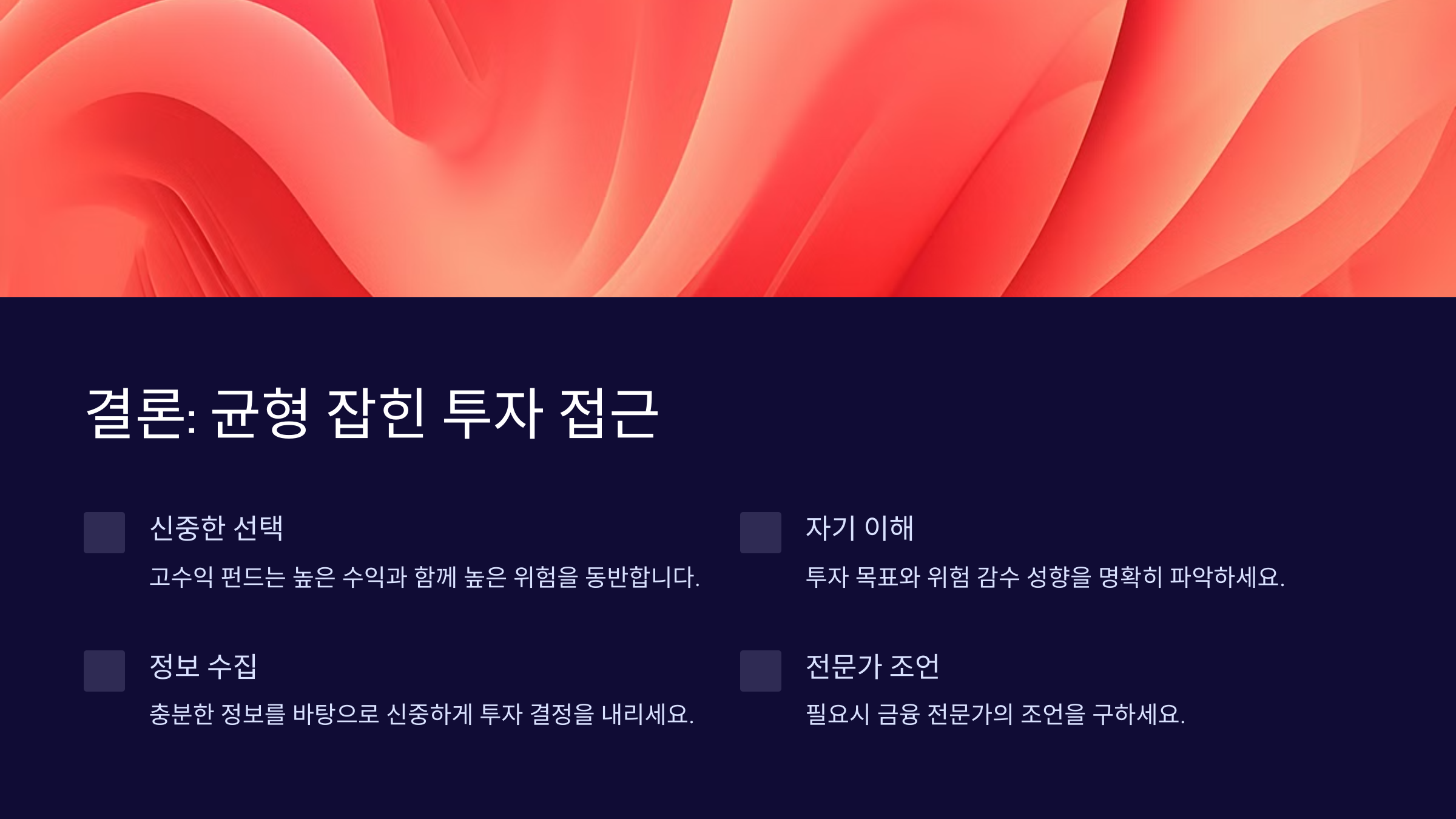 - 장기적인 관점: 고수익 펀드는 단기적인 변동성이 크므로, 장기적인 관점에서 접근하는 것이 바람직합니다.