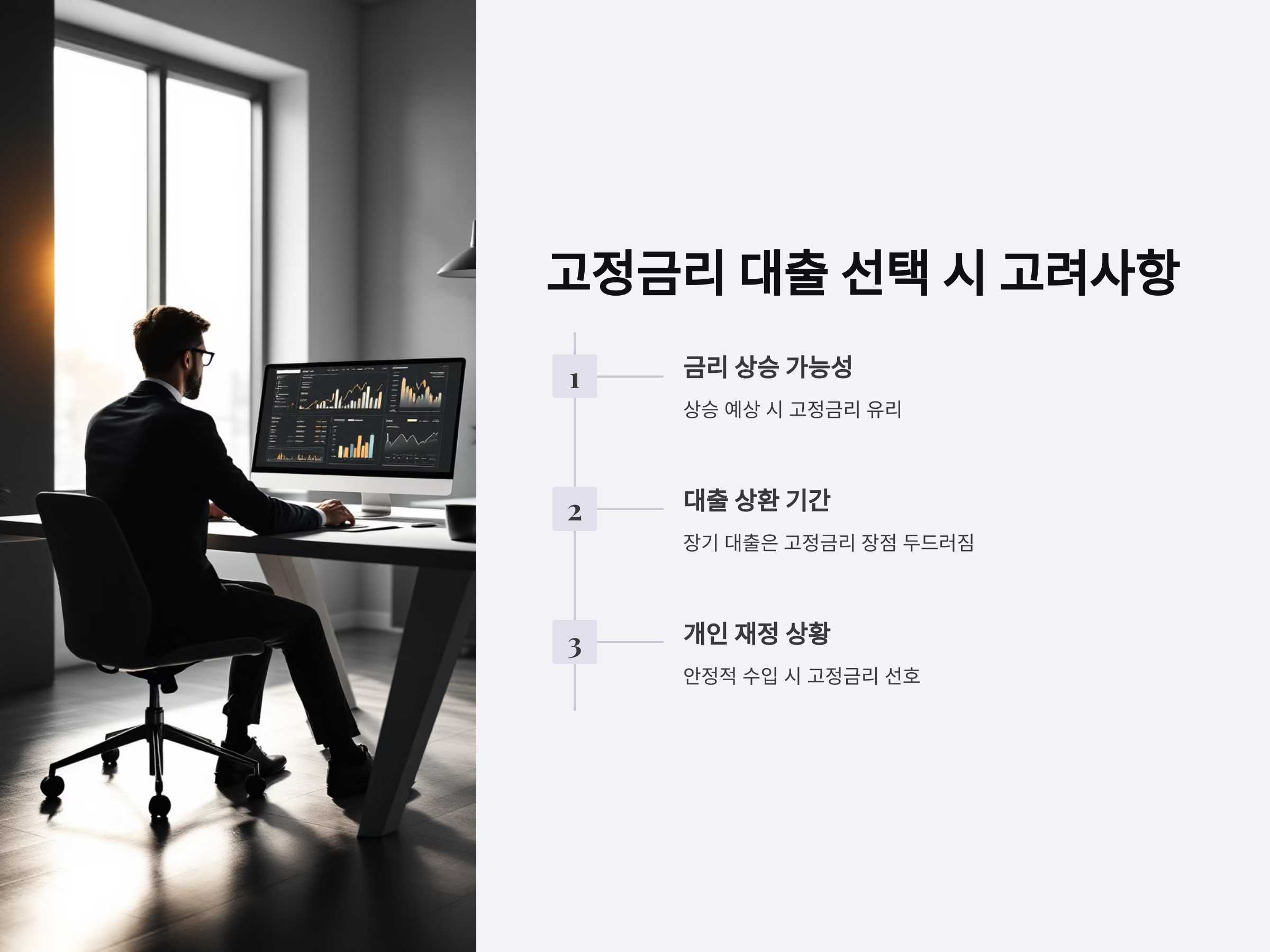 고정금리 대출을 선택할 때는 몇 가지 중요한 요소들을 고려해야 합니다. 금리가 고정되었을 때 얻을 수 있는 안정적인 혜택과, 금리가 변동하는 경제 상황에서의 리스크를 함께 고려해야 합니다.