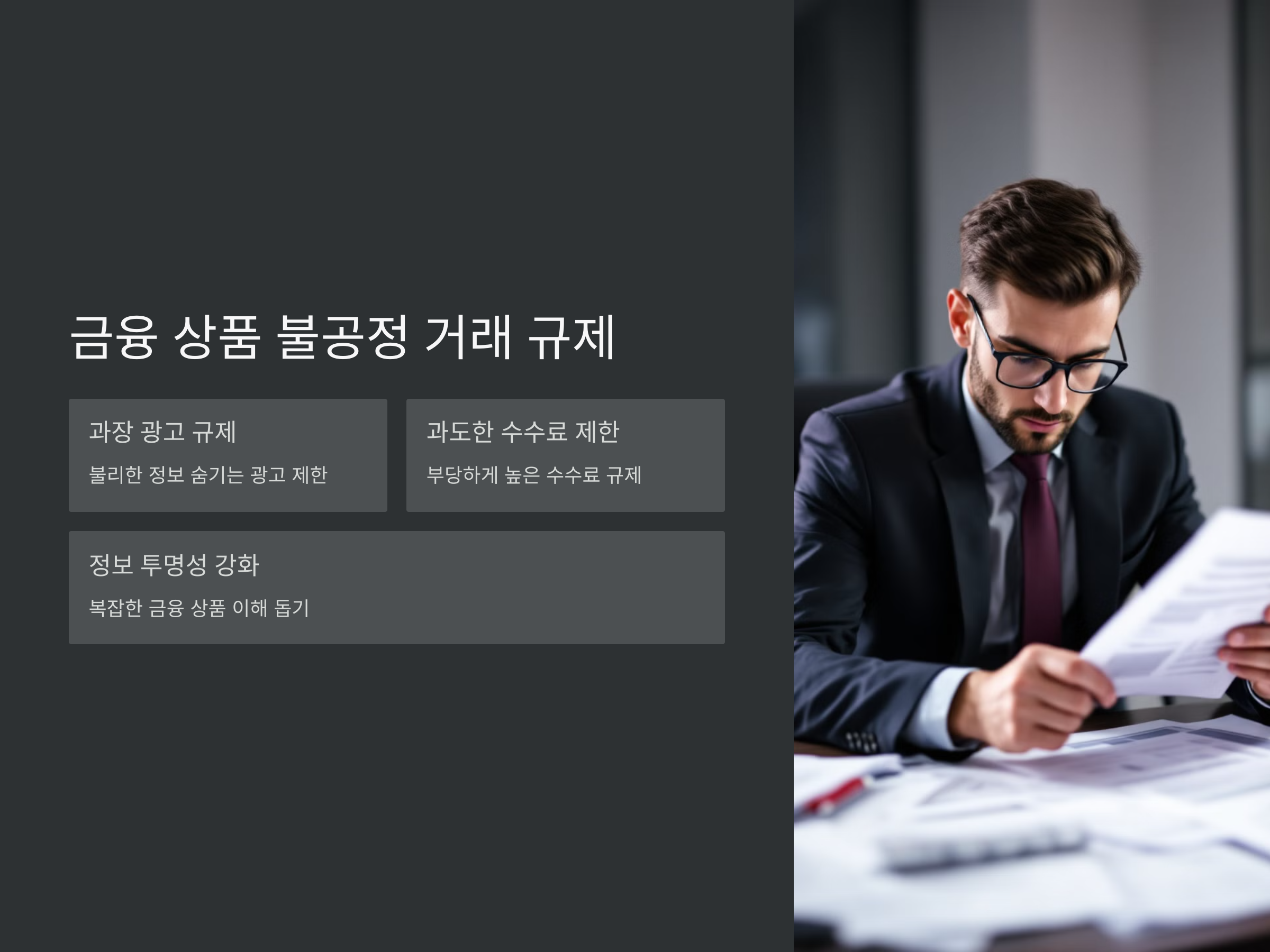 - 소비자 보호: 금융 거래에서 발생할 수 있는 불법적인 불공정 행위, 예를 들어 금융 상품의 불공정 광고나 고의적인 정보 왜곡에 대한 처벌을 강화합니다.