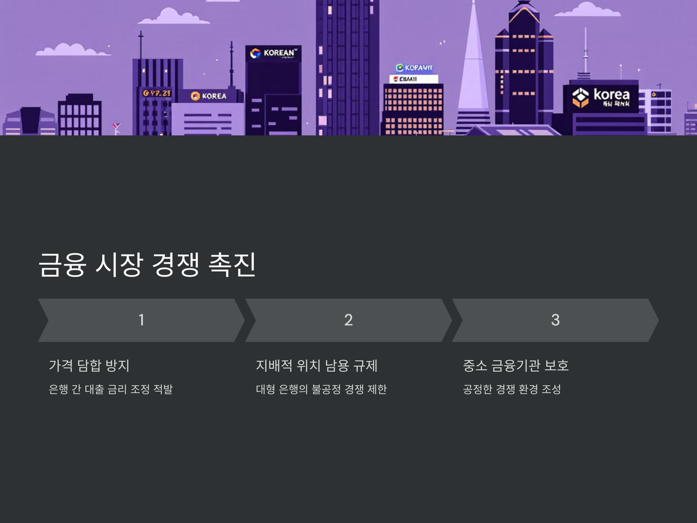 - 지배적 위치 남용: 대형 은행이 소규모 금융기관들의 경쟁을 압도하려는 시도에 대해 규제를 강화합니다.