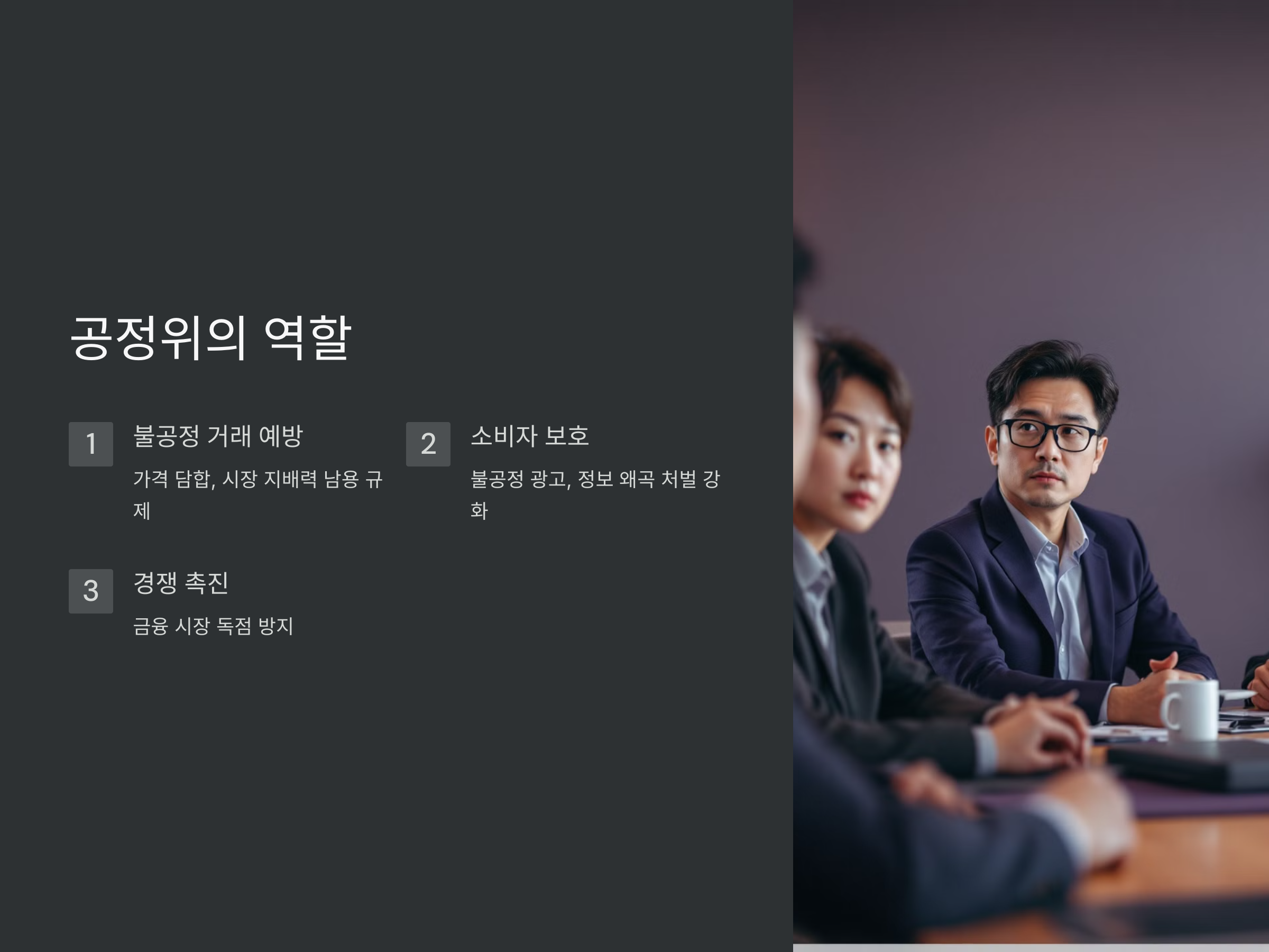 - 불공정 거래 행위 예방: 금융기관들이 가격 담합이나 시장 지배적 지위를 남용하여 다른 기업의 경쟁을 제한하는 경우, 공정위는 이를 엄격히 규제합니다.