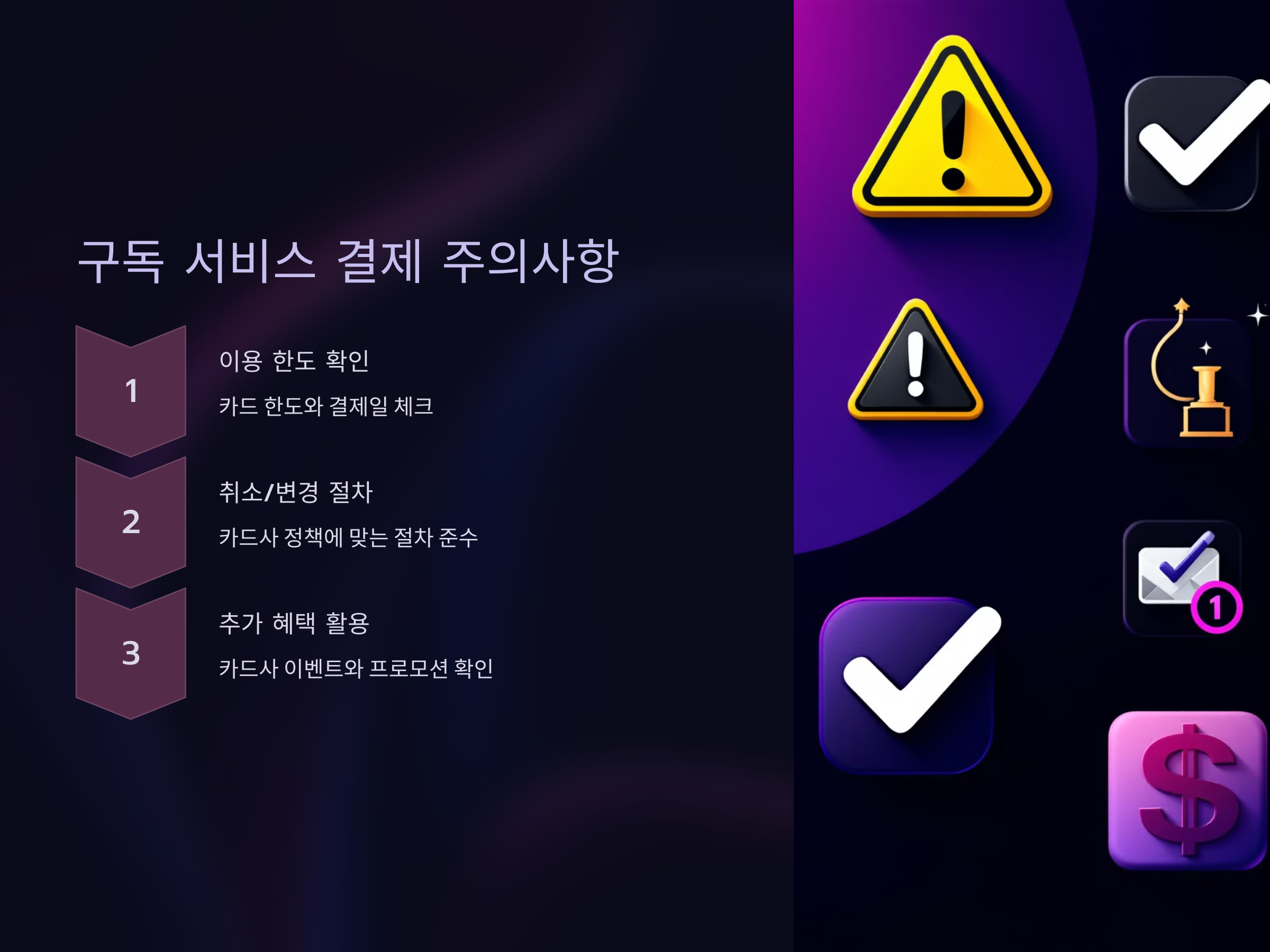 구독 서비스 결제를 위해 카드를 사용할 때 몇 가지 주의할 점이 있습니다. 첫째, 카드의 이용 한도와 결제일을 잘 확인해야 합니다. 둘째, 구독 서비스를 취소하거나 변경할 때, 카드사의 정책에 맞는 절차를 준수해야 합니다. 셋째, 카드사에서 제공하는 이벤트나 추가 혜택을 잘 활용해야 합니다. 예를 들어, 구독 서비스에 대한 포인트 적립 외에도 특정 카드사에서는 특별한 프로모션을 제공하기도 합니다.