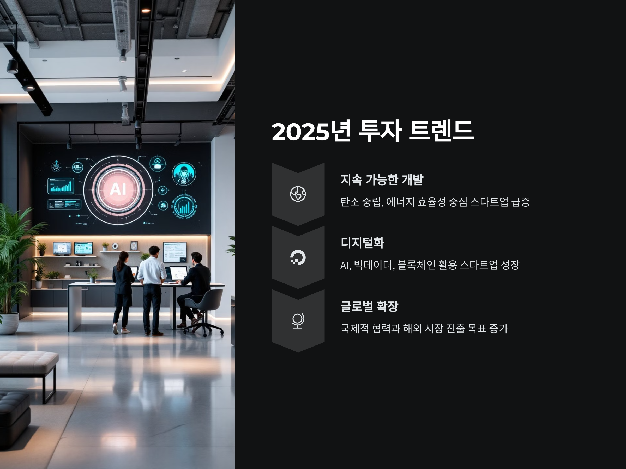 2025년 국내 스타트업 투자 트렌드는 크게 두 가지로 나눠볼 수 있습니다. 첫째, ‘지속 가능한 개발(SDGs)’에 초점을 맞춘 스타트업들이 급증할 것으로 보입니다. 글로벌 기후 변화와 환경 문제에 대한 대응으로 탄소 중립, 에너지 효율성, 친환경적인 제품 및 서비스가 시장의 핵심으로 떠오르고 있습니다. 이와 관련된 스타트업들이 투자자들로부터 큰 관심을 끌고 있으며, 그린테크 및 관련 산업의 성장이 예상됩니다.