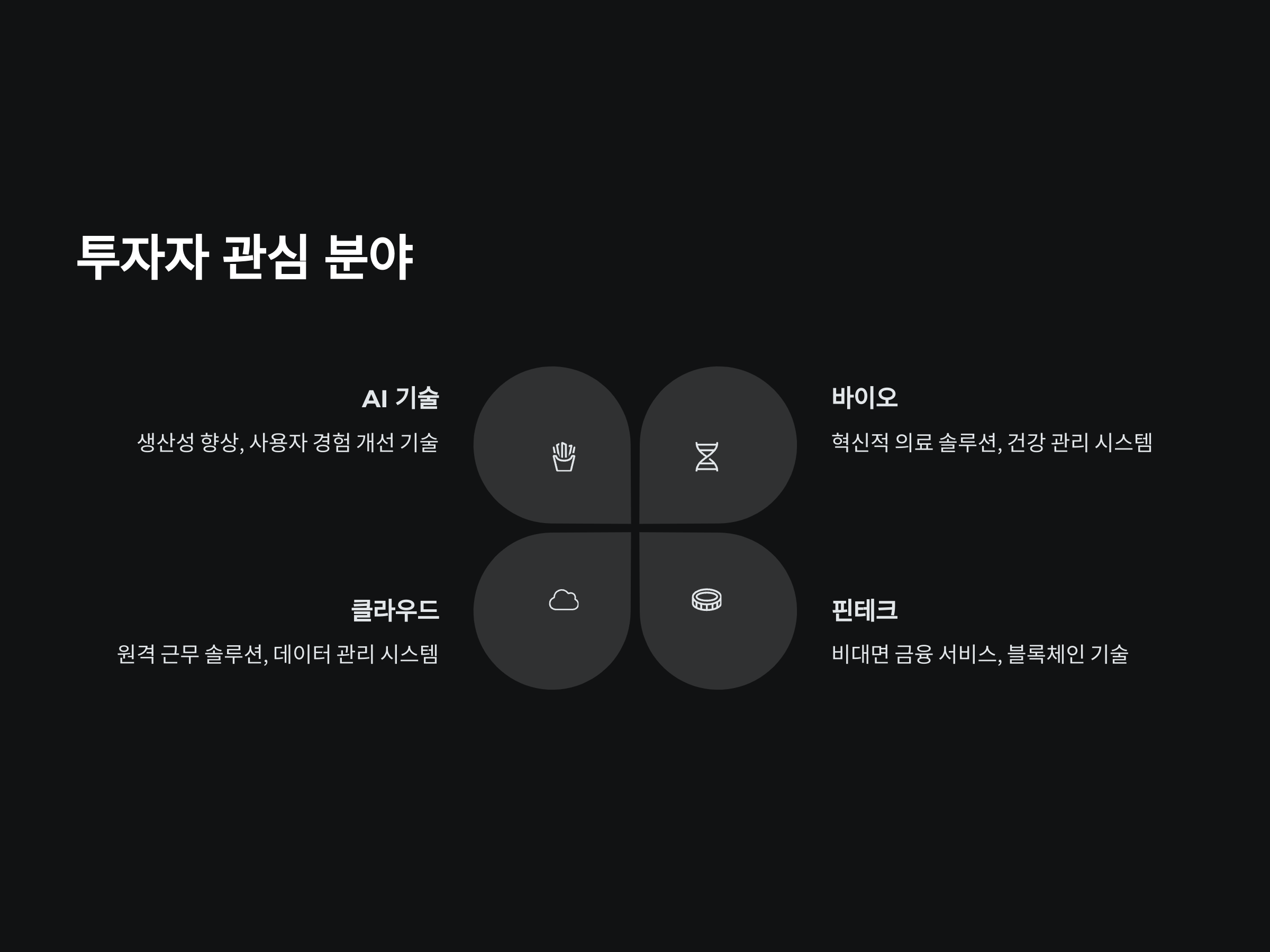 스타트업 투자자들은 현재 기술 혁신에 기반한 비즈니스 모델에 큰 관심을 두고 있습니다. 특히, 인공지능(AI)과 빅데이터 기술을 활용한 스타트업들이 큰 투자를 받고 있으며, 헬스케어와 바이오 분야 역시 주목받고 있습니다. 이러한 기술들은 기업의 생산성 향상, 사용자 경험 개선, 그리고 새로운 시장 창출 등을 가능하게 합니다.