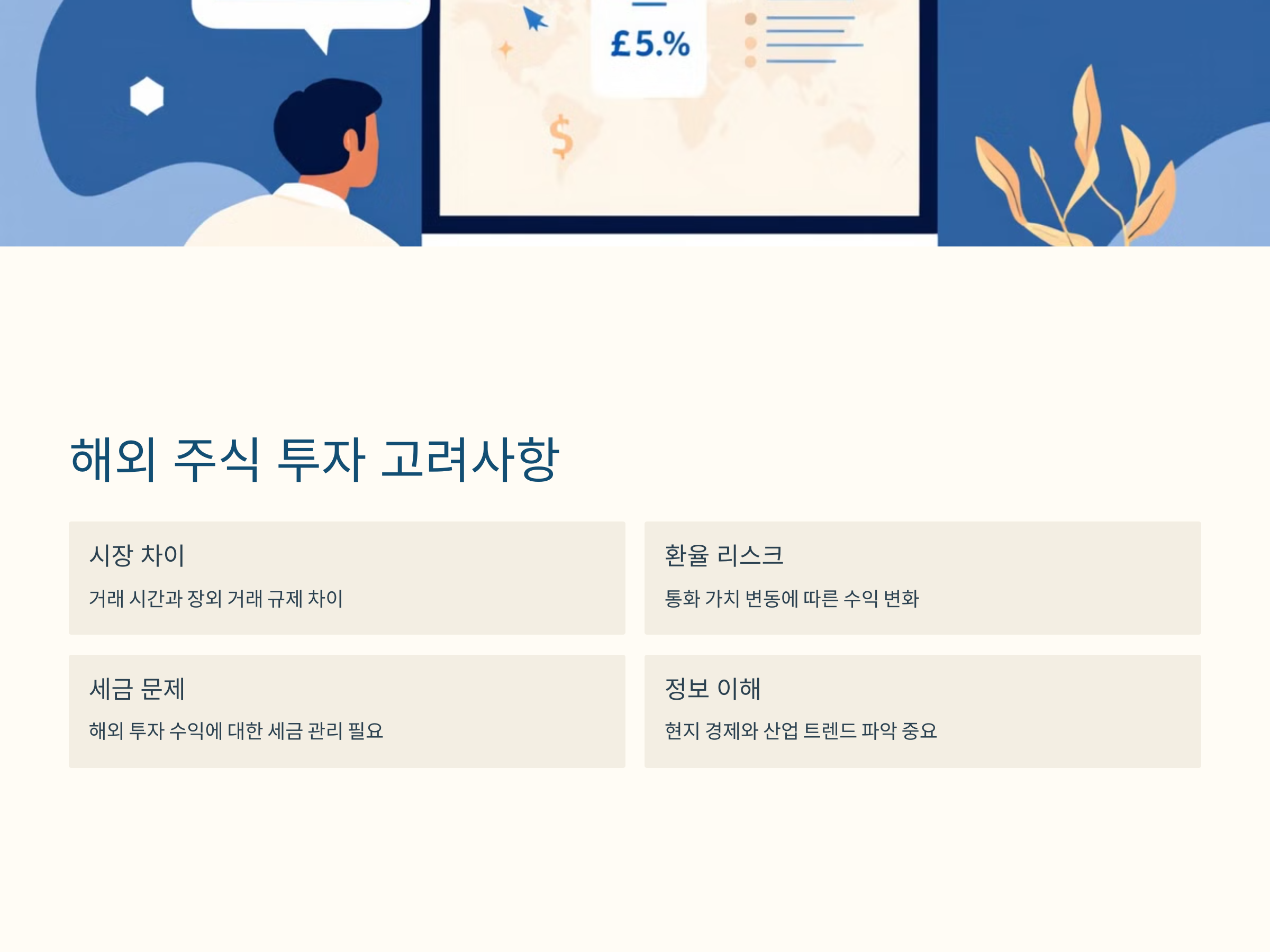 해외 주식에 투자할 때는 여러 가지 요소를 고려해야 합니다. 우선, 해외 주식의 시장은 한국 시장과 다른 점이 많습니다. 예를 들어, 주식 거래 시간이나 장외 거래의 규제가 다를 수 있기 때문에, 해외 주식의 규제 환경을 정확히 이해하는 것이 중요합니다.