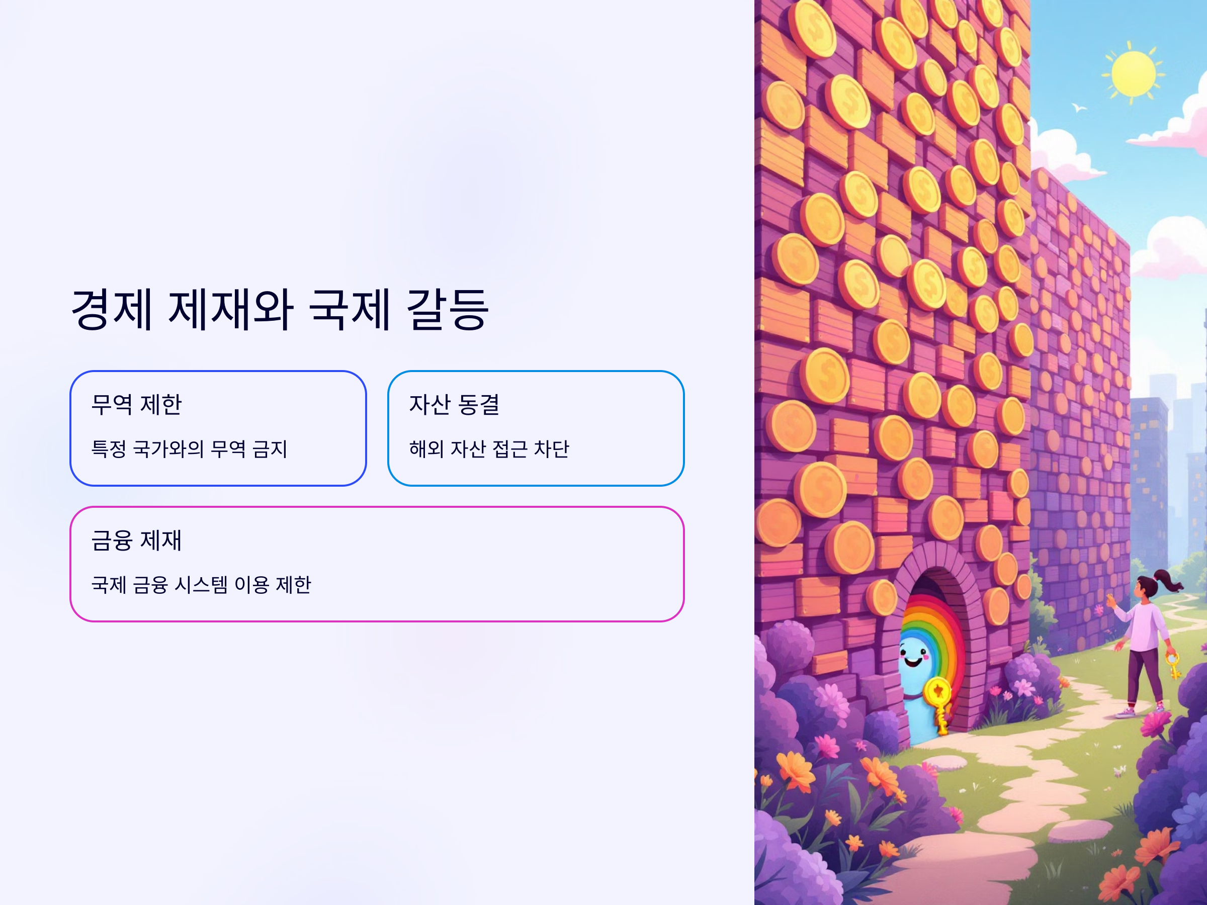 경제 제재는 국가 간의 경제적 갈등을 해결하는 수단 중 하나로 사용됩니다. 이는 주로 특정 국가의 정책에 대해 강력한 경제적 압박을 가하는 방법으로, 무역 제한, 자산 동결, 금융 제재 등이 포함됩니다. 경제 제재는 국제사회에서 갈등을 해결하는 중요한 도구로 사용될 수 있지만, 그 효과에 대해서는 논란이 존재합니다.