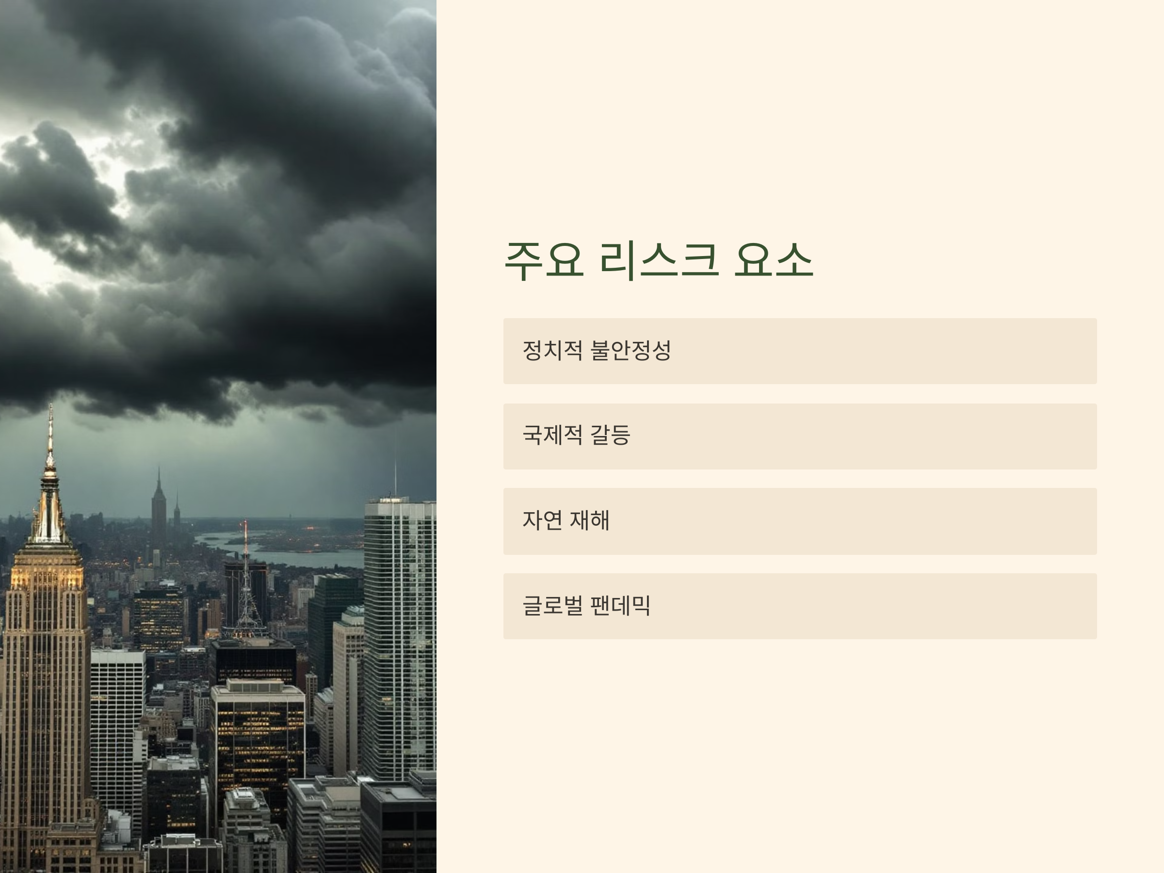 A1: 가장 큰 리스크 요소는 정치적 불안정성과 국제적인 갈등입니다. 특히, 미국과 중국 간의 무역 전쟁이나 다른 국가들의 정치적 변화가 금융 시장에 큰 영향을 미칠 수 있습니다.