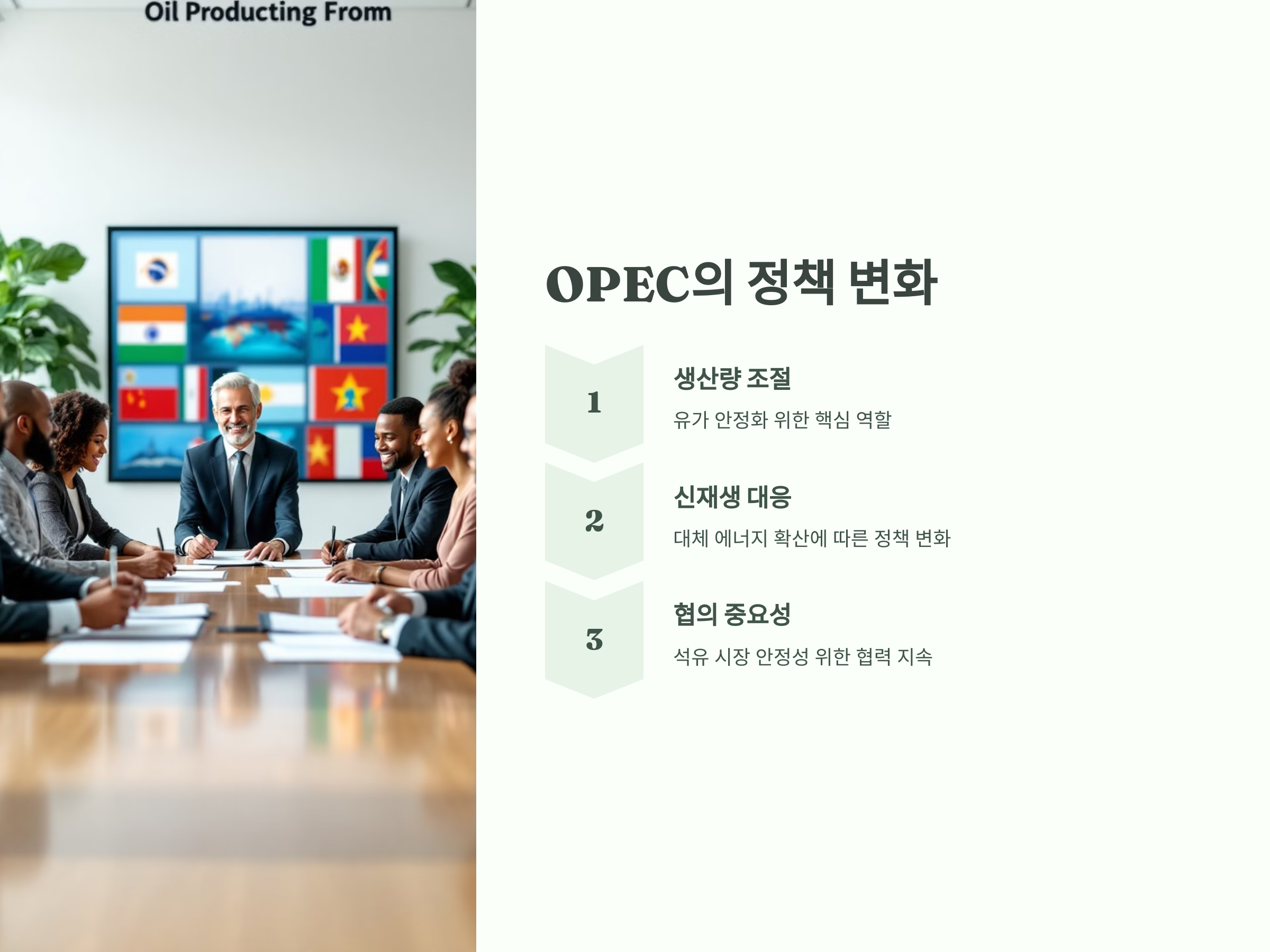 OPEC은 석유 생산량을 조절하여 유가를 안정시키는 중요한 역할을 해왔습니다. 2025년에는 OPEC이 기존의 생산량 조정 외에도 새로운 정책을 채택할 가능성이 있습니다. 특히, 석유 수출국들이 신재생 에너지의 확산에 대응하기 위해 생산량을 조절하는 방식도 예측되고 있습니다.