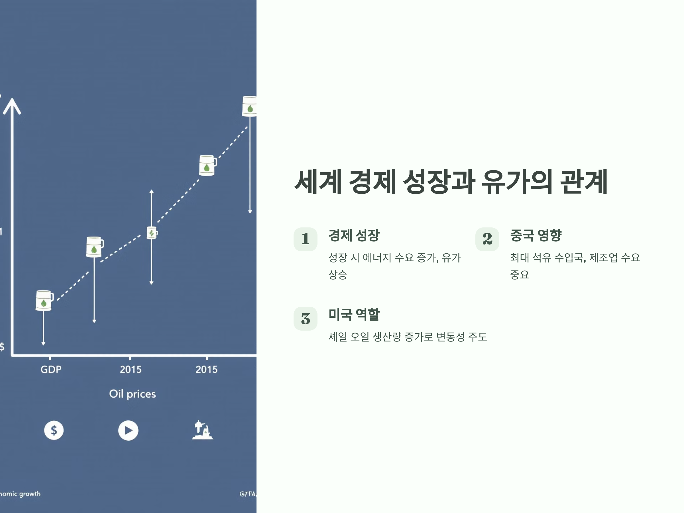세계 경제의 성장률은 국제 유가에 큰 영향을 미칩니다. 경제가 성장하면 에너지 수요도 증가하고, 이는 유가를 상승시킬 가능성이 큽니다. 반면, 경제 침체나 불황이 지속되면 석유 수요가 감소하여 유가는 하락할 수 있습니다. 특히 2025년에는 미국과 중국의 경제 성장률이 중요한 변수로 작용할 것입니다.