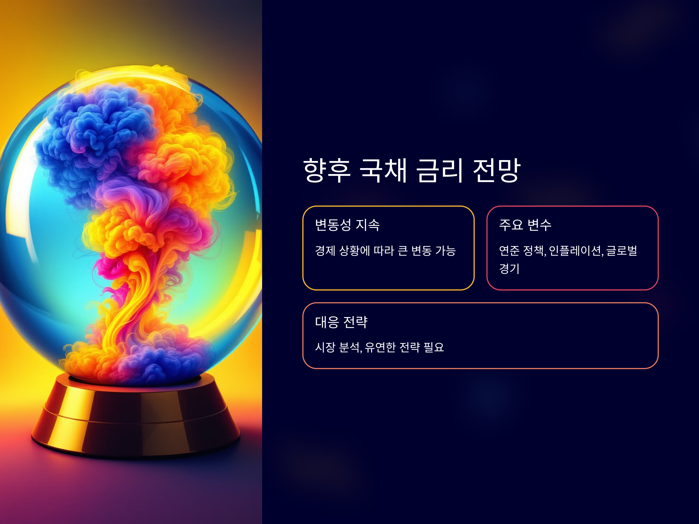 전문가들은 향후 국채 금리가 경제 상황에 따라 크게 변동할 가능성이 있다고 보고 있습니다. 특히 미국 연준의 금리 정책 변화, 인플레이션 압력, 글로벌 경기 둔화 여부 등이 주요 변수가 될 것입니다. 따라서 투자자들은 시장의 흐름을 면밀히 분석하고 유연한 대응 전략을 마련하는 것이 중요합니다.