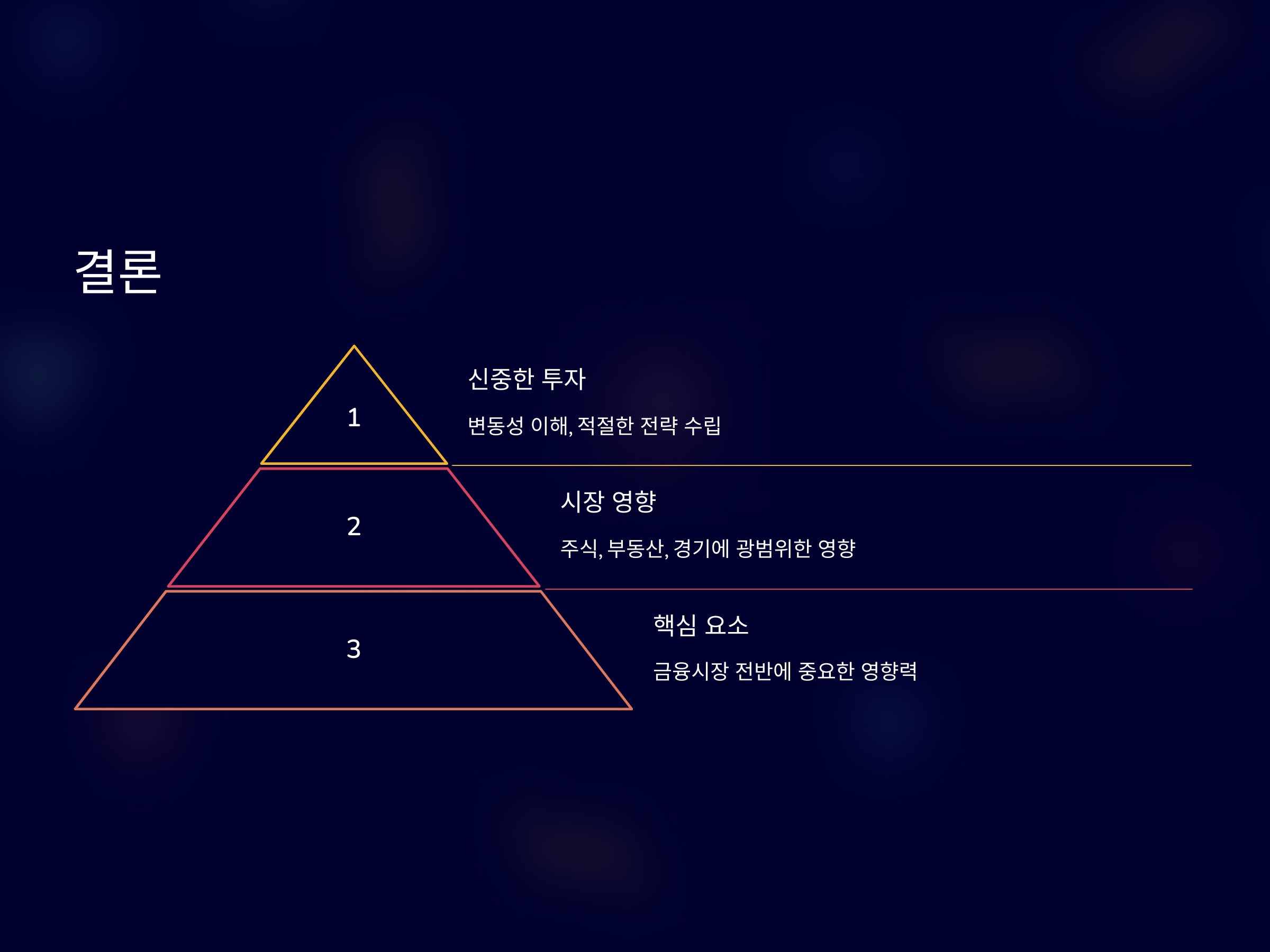 국채 금리 변동성은 금융시장 전반에 걸쳐 영향을 미치는 중요한 요소입니다. 중앙은행의 정책 변화, 인플레이션 압력, 글로벌 금융시장의 흐름 등을 고려하여 신중하게 투자 전략을 수립해야 합니다. 국채 금리가 상승하면 주식시장과 부동산 시장이 위축될 가능성이 크며, 반대로 하락하면 경기 침체 우려가 커질 수 있습니다. 따라서 국채 금리 변동성을 이해하고 적절한 투자 전략을 마련하는 것이 필수적입니다.
