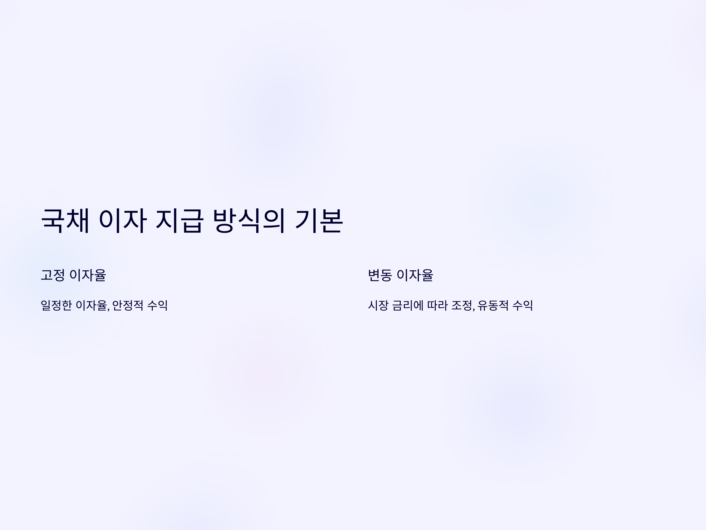 국채 이자 지급 방식은 채권의 종류와 발행 조건에 따라 달라집니다. 기본적으로 국채는 두 가지 주요 이자 지급 방식이 있습니다. 첫 번째는 고정 이자율 방식이고, 두 번째는 변동 이자율 방식입니다. 각 방식의 차이를 알아보겠습니다.