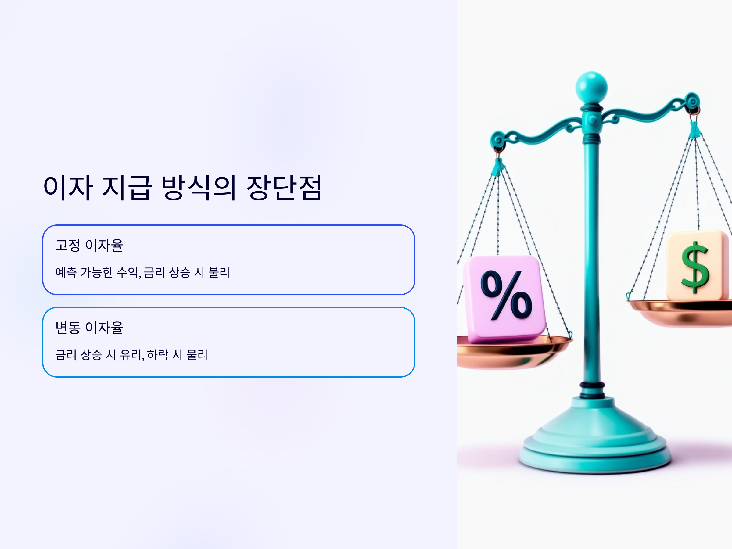 변동 이자율 방식의 장점은 금리가 상승할 경우, 이자 지급액이 증가할 수 있다는 점입니다. 이는 금리가 상승하는 시점에서 더욱 유리하게 작용할 수 있습니다. 하지만 금리가 하락할 경우 이자 지급액이 줄어드는 단점도 존재하므로, 금리 변화에 민감한 투자자에게는 불확실한 요소가 될 수 있습니다.