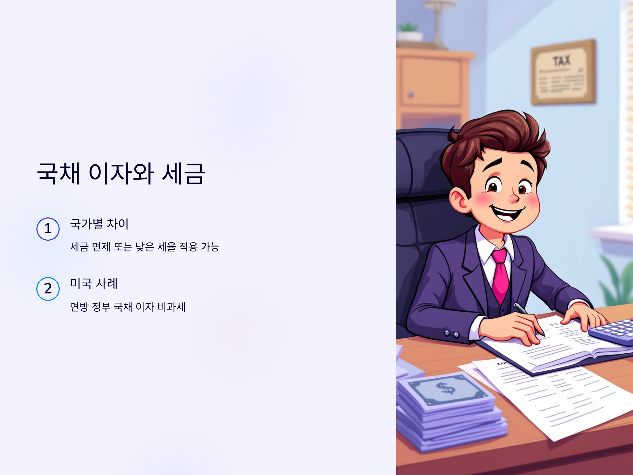 국채 이자에 대한 세금은 투자자에게 중요한 고려 요소 중 하나입니다. 국채 이자에 대한 세금은 국가별로 다르지만, 대부분 국가에서는 국채 이자에 대해 세금을 부과합니다. 다만, 많은 국가에서는 국채 이자에 대한 세금을 면제하거나, 세금이 다른 채권에 비해 상대적으로 낮게 부과되는 경우도 많습니다. 예를 들어, 미국에서는 연방 정부의 국채 이자는 세금이 부과되지 않지만, 주 정부나 지방 정부의 국채 이자는 과세될 수 있습니다.
