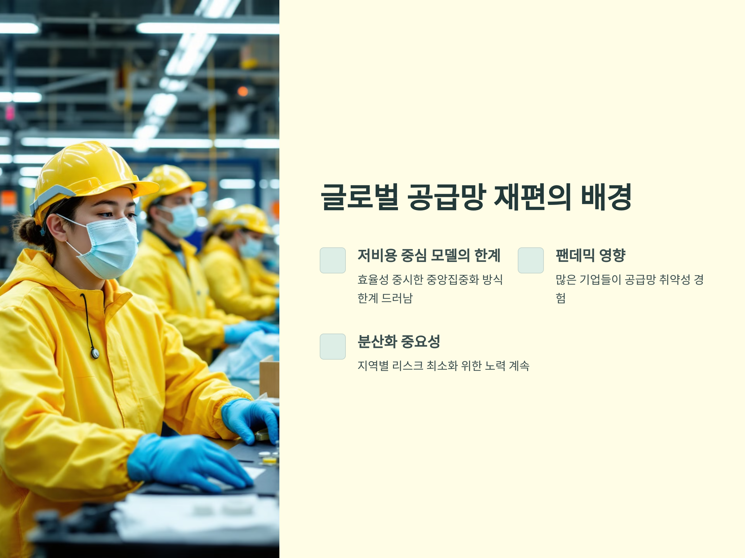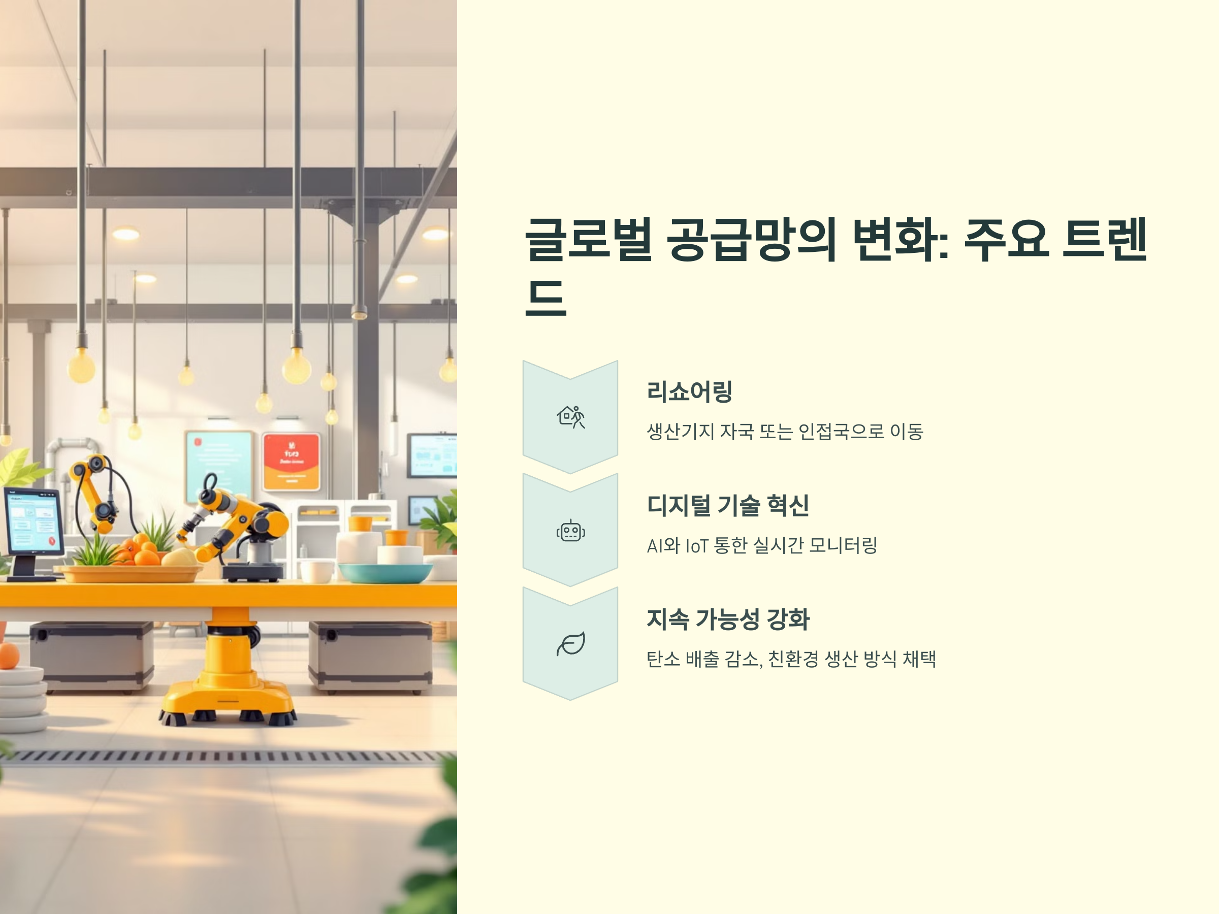 최근 몇 년간 글로벌 공급망에서 눈에 띄는 변화가 있었습니다. 첫 번째는 '리쇼어링'(Reshoring)입니다. 많은 기업들이 비용 절감을 위해 해외로 생산을 이전했던 것을 다시 자국으로 돌아가거나 가까운 국가로 이동시키고 있습니다. 이는 생산지의 물리적 거리가 가까워지면서 물류비용 절감과 리드 타임 단축을 기대할 수 있기 때문입니다.