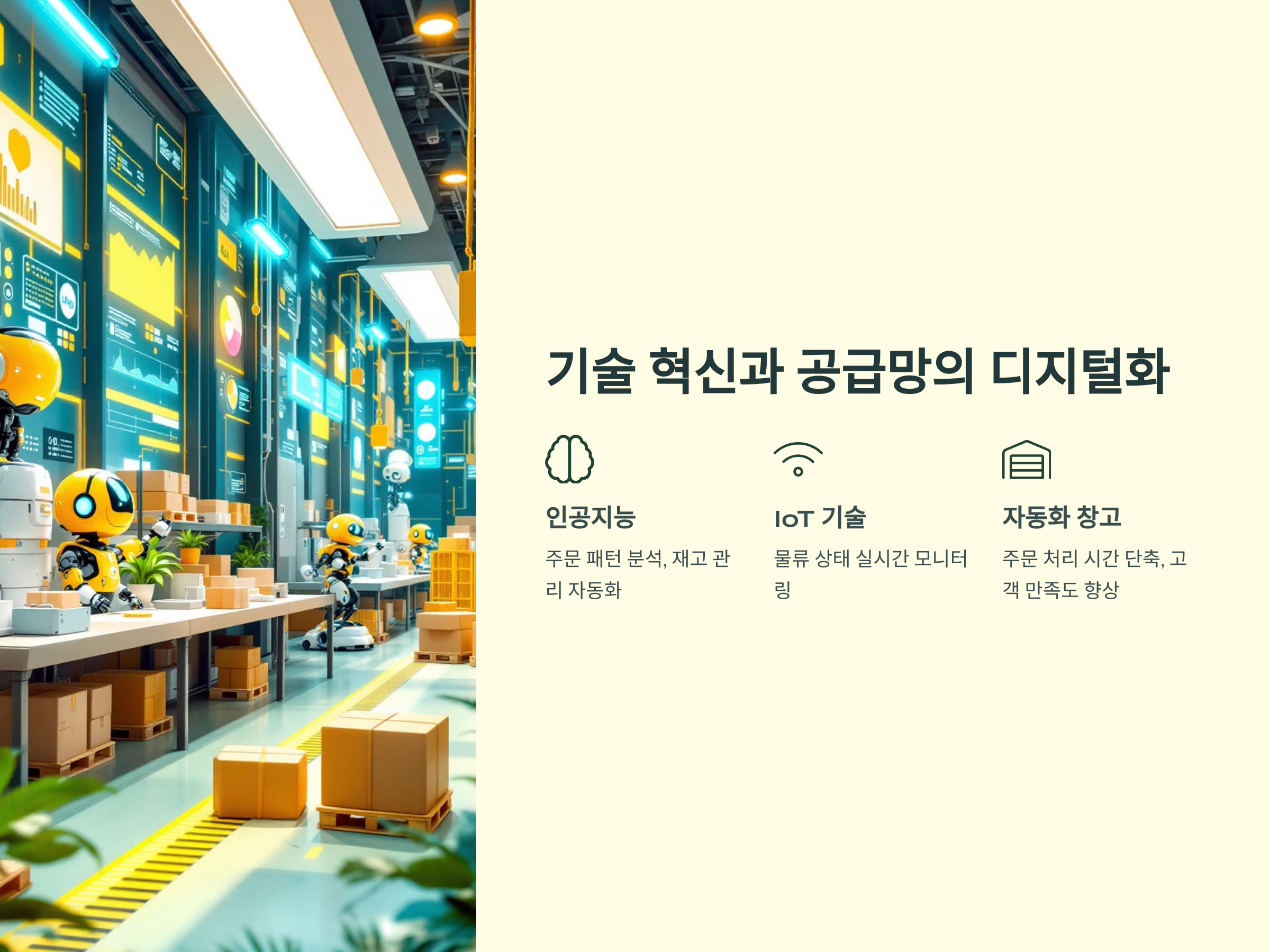 디지털 기술은 공급망의 효율성을 극대화하는 데 중요한 역할을 합니다. 특히, 인공지능(AI)과 머신러닝은 공급망의 문제를 미리 예측하고, 빠르게 대응할 수 있는 기능을 제공합니다. 또한, IoT 기술을 활용하면 물류의 상태를 실시간으로 모니터링하고, 필요한 조치를 즉시 취할 수 있습니다.