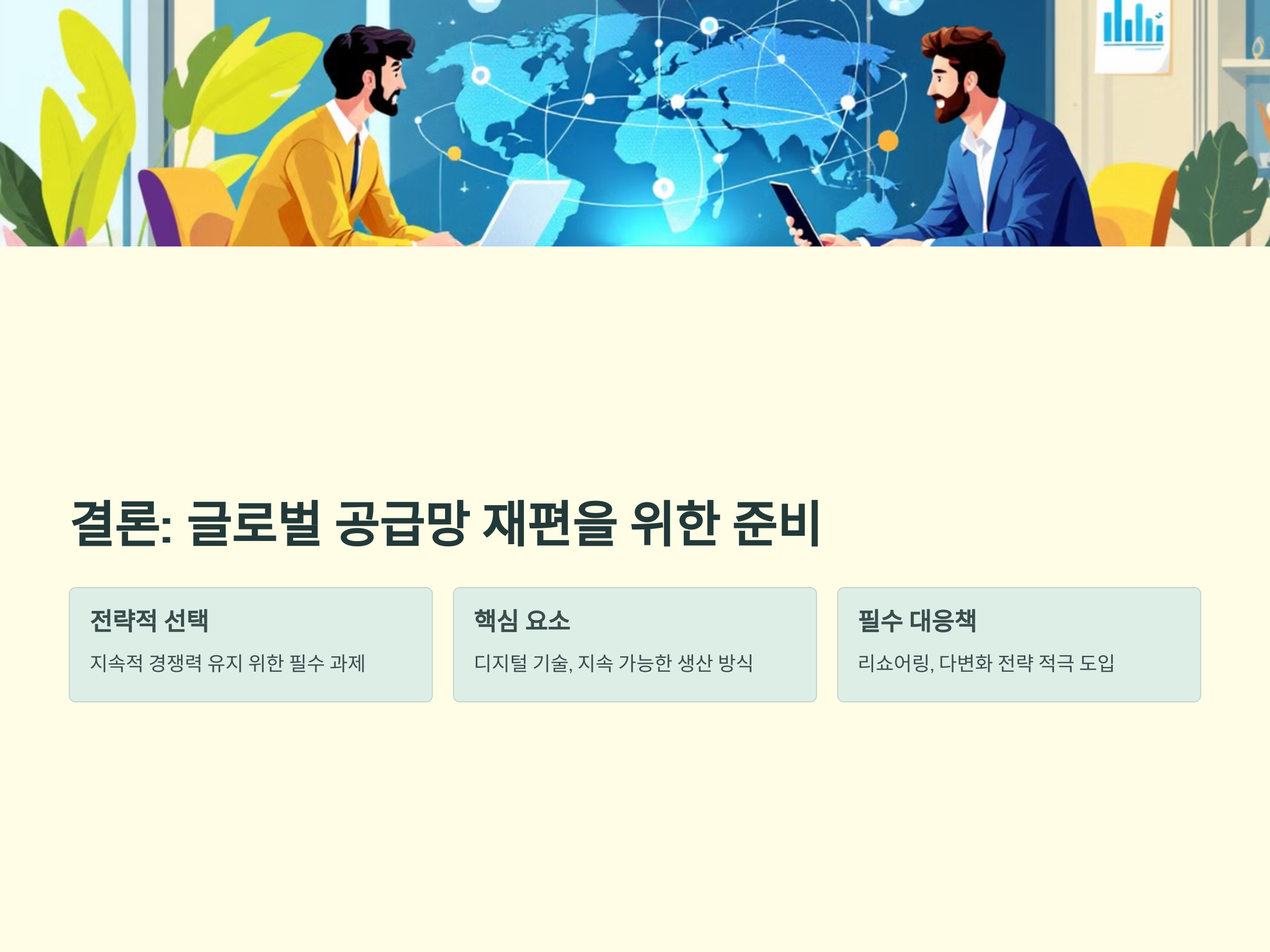 결론적으로, 글로벌 공급망의 재편은 단기적인 문제가 아니라, 기업의 지속적인 경쟁력을 유지하기 위한 전략적인 선택이 되었습니다. 기업들은 공급망 리스크를 최소화하고, 효율성을 극대화하는 방식으로 재편을 추진하고 있습니다. 디지털 기술과 지속 가능한 생산 방식이 그 핵심 요소로 자리 잡고 있으며, 리쇼어링과 다변화 전략은 더 이상 선택이 아닌 필수적인 대응책이 되었습니다.