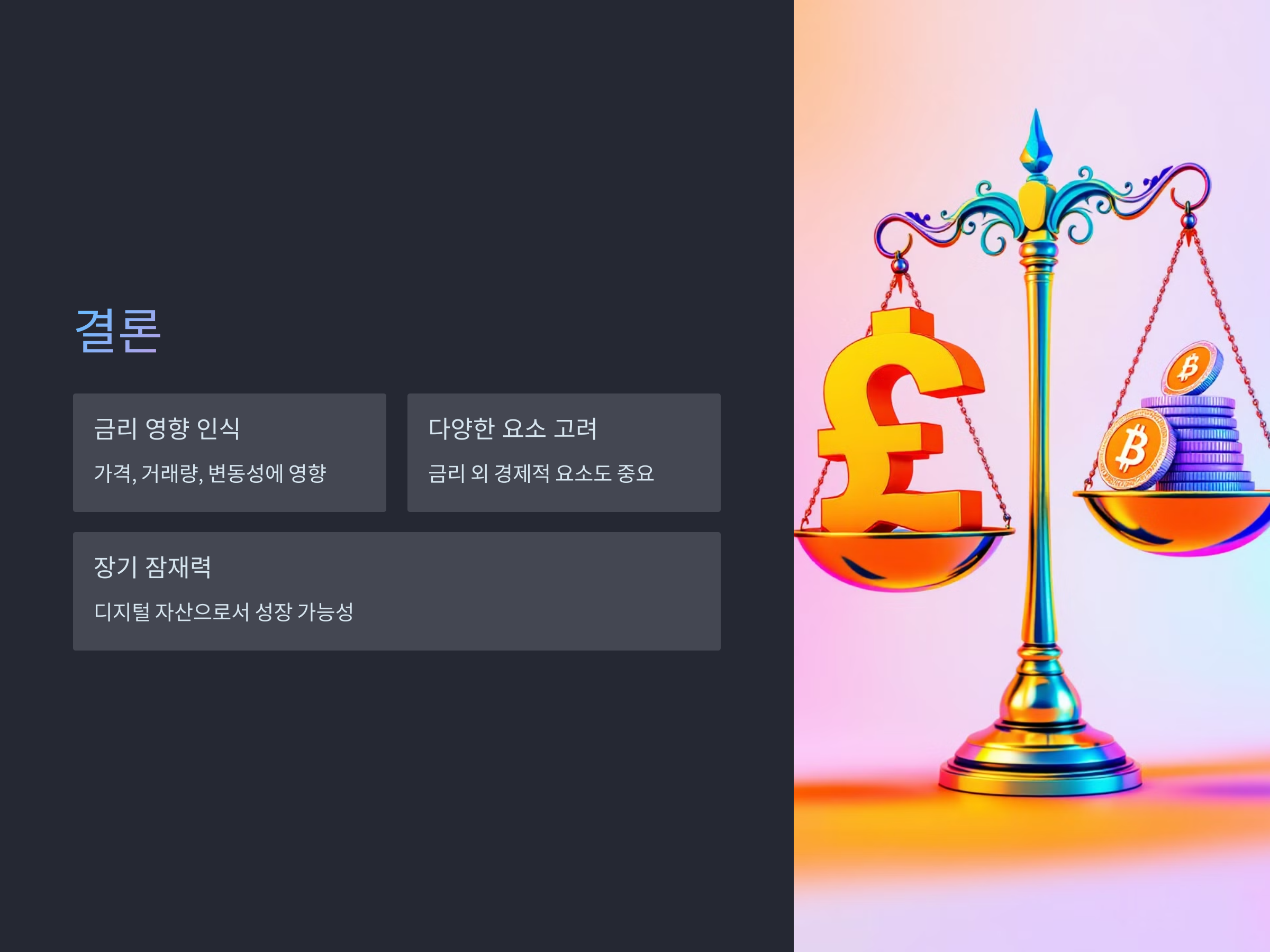 따라서, 가상화폐 시장에서 투자자들은 금리 변화를 면밀히 분석하고, 금리 변화에 따라 전략을 변경해야 합니다. 금리가 상승할 경우 리스크 관리에 주의하고, 금리가 낮을 경우 적극적인 투자 전략을 취할 수 있습니다.