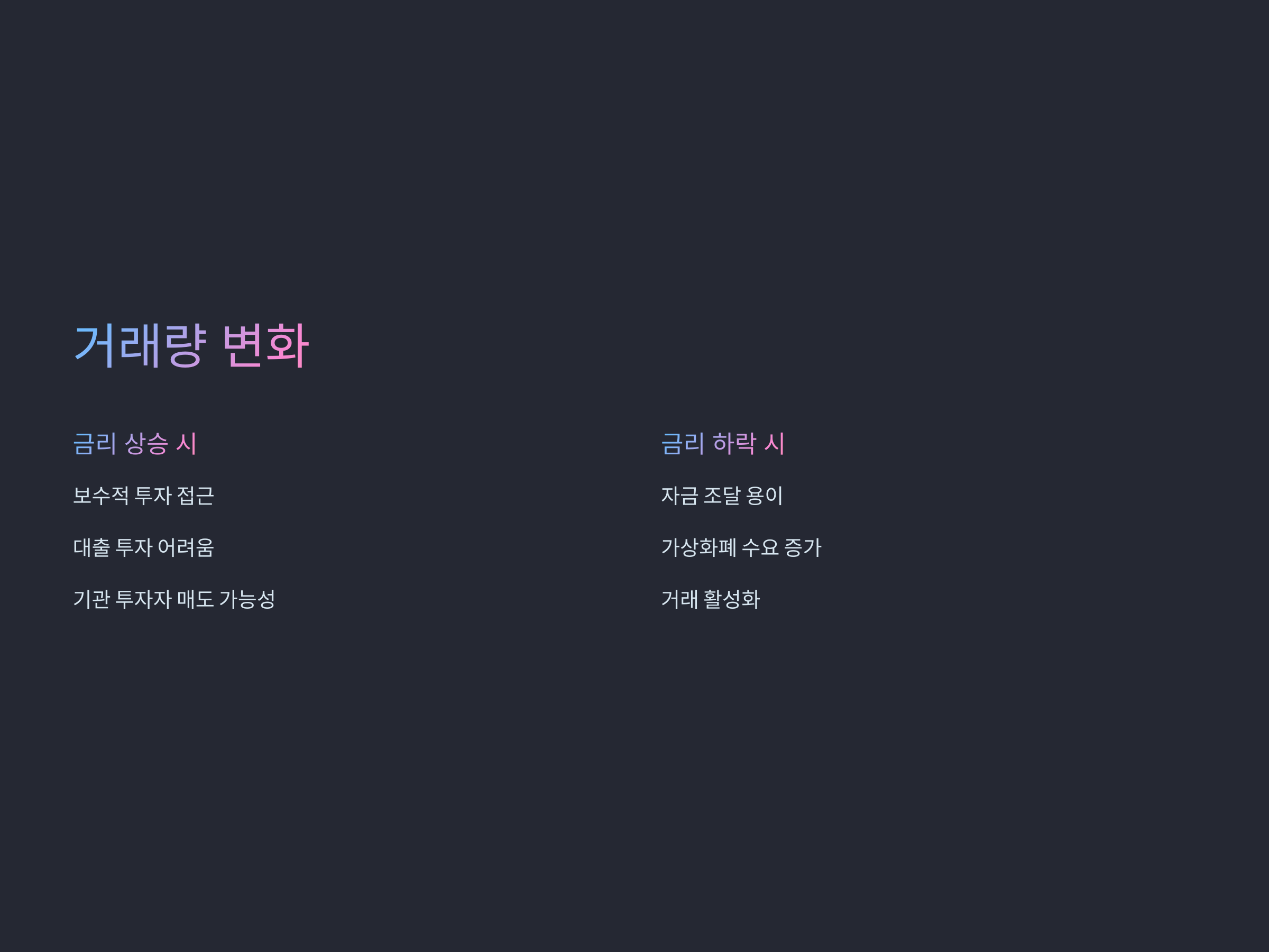 반면 금리가 낮을 경우, 투자자들이 대출을 통해 자금을 쉽게 마련할 수 있기 때문에 가상화폐 시장의 거래량이 증가하는 경향이 있습니다. 금리가 낮으면 자금 조달이 용이해지고, 이에 따라 가상화폐에 대한 수요가 늘어날 수 있습니다. 또한, 낮은 금리는 가상화폐를 다른 자산보다 더 매력적으로 만들어 거래가 활성화될 수 있습니다.