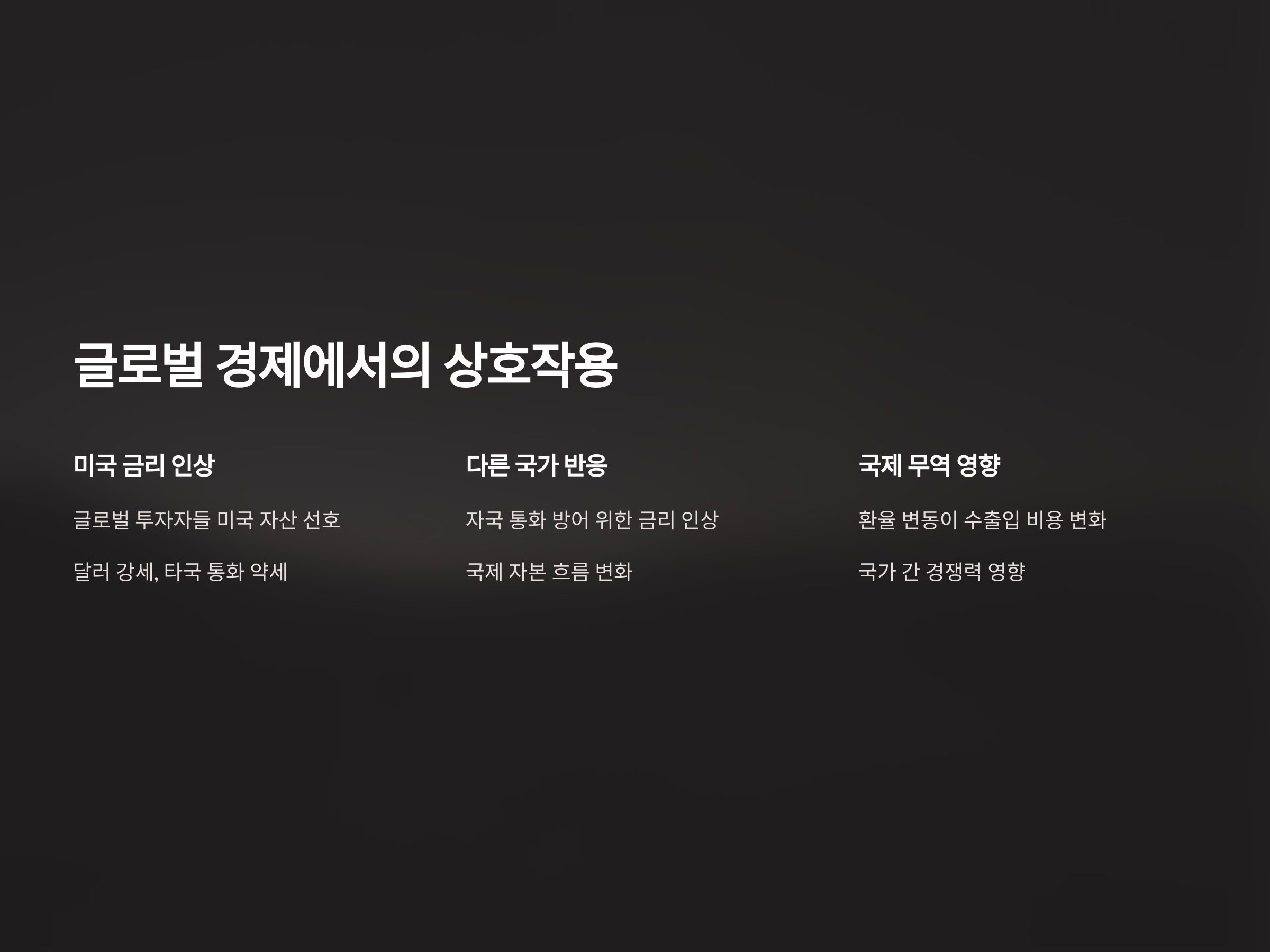 글로벌 경제에서는 금리와 환율이 서로 밀접하게 연관되어 있습니다. 금리 변동은 국제 자본 흐름에 큰 영향을 미치며, 환율은 국제 무역에서 중요한 변수로 작용합니다. 각국의 중앙은행들이 금리를 조정할 때, 다른 나라와의 환율 경쟁을 고려하는 경우가 많습니다. 예를 들어, 미국이 금리를 인상하면, 이는 다른 나라들의 금리 정책에 큰 영향을 미쳐 환율을 변화시킵니다.