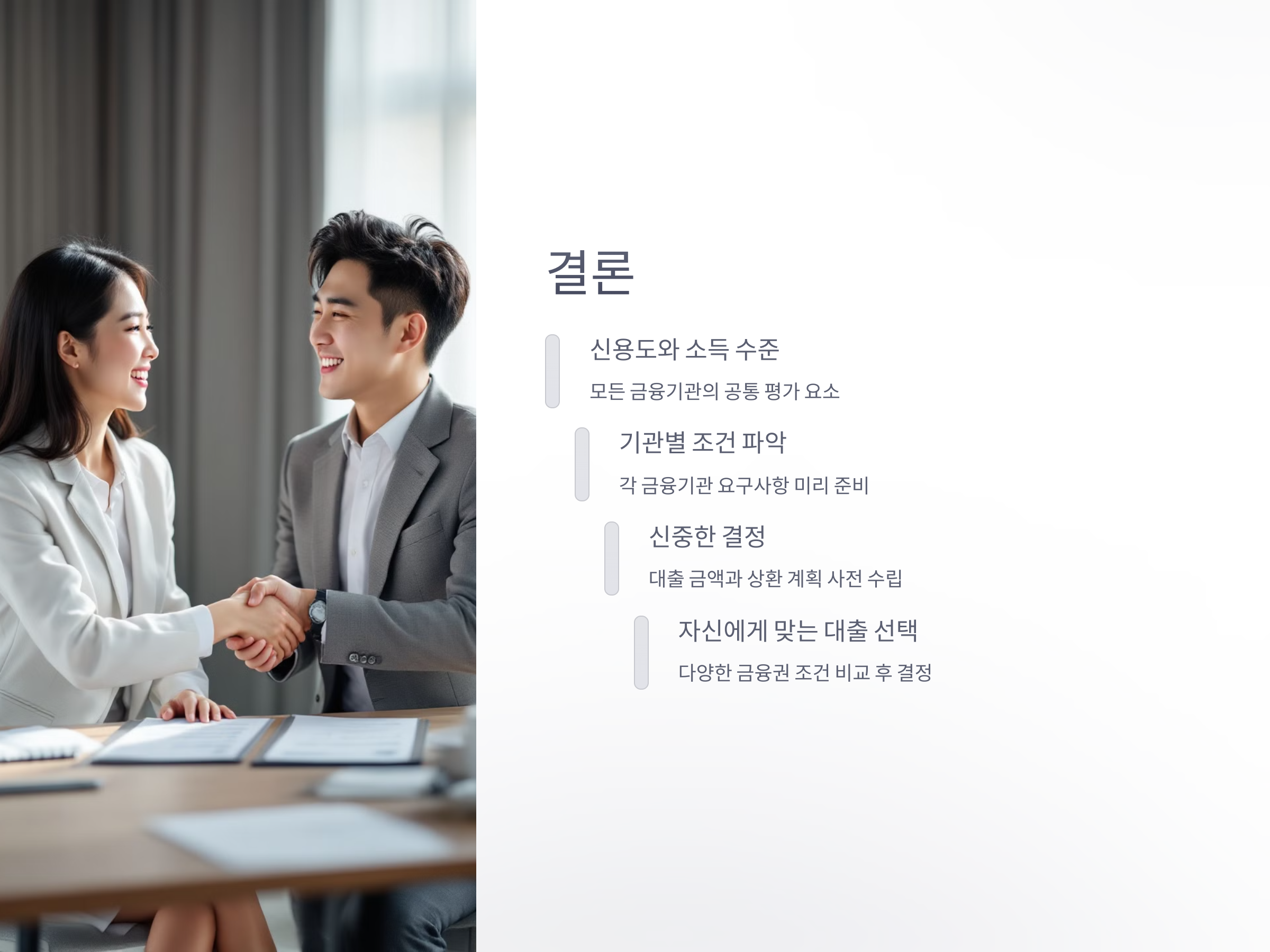 대출 승인을 받기 위해서는 자신의 신용 상태와 소득 상황을 정확하게 파악하고, 준비된 상태에서 신청하는 것이 좋습니다. 다양한 금융권의 대출 조건을 비교하고, 자신에게 맞는 대출을 선택하세요.