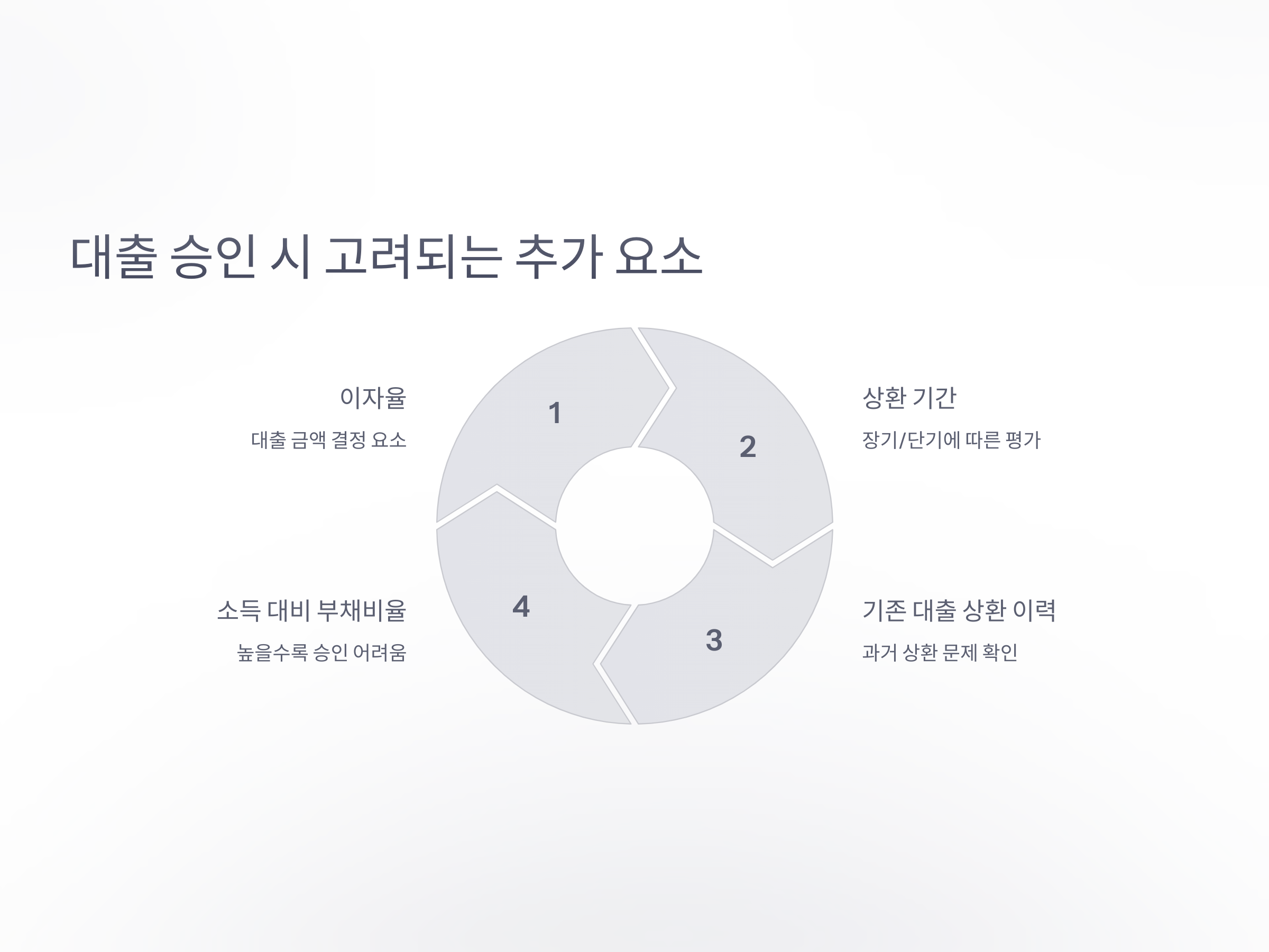 대출을 신청할 때 금융기관에서는 신용도와 소득 외에도 다양한 요소들을 고려합니다. 예를 들어, 이자율과 상환 기간을 고려하여 대출 금액을 결정하는 경우가 많습니다. 또한, 대출자의 기존 대출 상환 이력도 중요한 요소로, 이전 대출 상환에 문제가 있었던 경우에는 대출 승인이 어려울 수 있습니다.