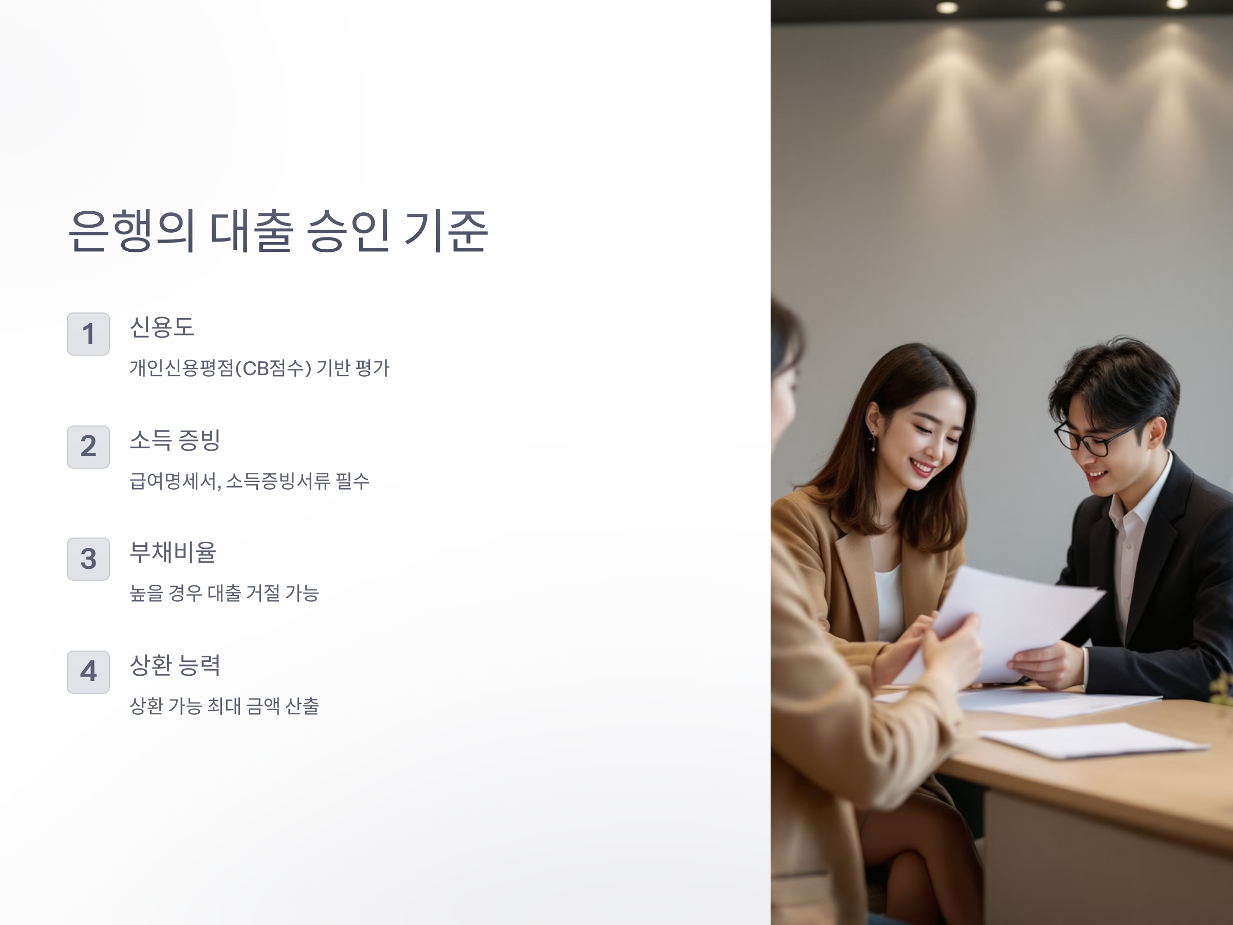 은행에서 대출을 받기 위한 주요 기준은 신용도와 소득 수준입니다. 신용도는 대출자의 신용카드 사용 이력, 대출 상환 내역 등을 기반으로 점수화되며, 보통 개인신용평점(CB점수)을 사용합니다. 은행은 이 점수를 통해 대출자가 얼마나 상환을 잘 해왔는지를 평가합니다. CB점수가 높을수록 대출 승인이 유리하고, 낮을수록 대출 승인을 받기 어렵습니다.