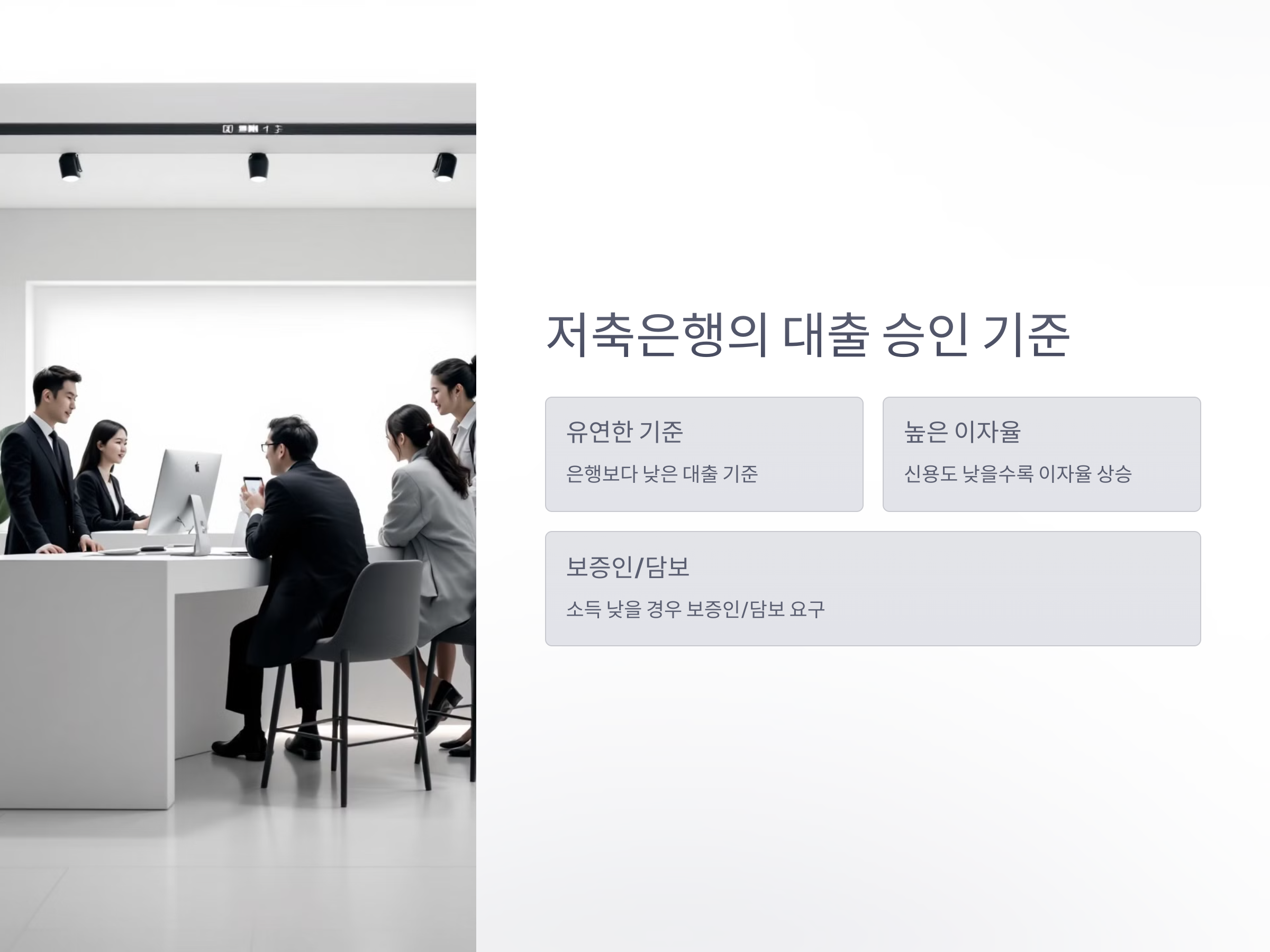 저축은행의 대출 승인 기준은 은행보다는 다소 유연하지만, 신용도가 낮을 경우 높은 이자율을 부과하는 경우가 많습니다. 저축은행은 은행보다는 대출 기준이 낮기 때문에 상대적으로 신용도가 낮은 사람도 대출을 받을 수 있는 기회가 많습니다. 그러나 저축은행에서 대출을 받는 경우에는 신용도가 낮은 대신 대출 한도가 적고, 이자율이 은행보다 높은 경우가 많다는 점을 인지해야 합니다.