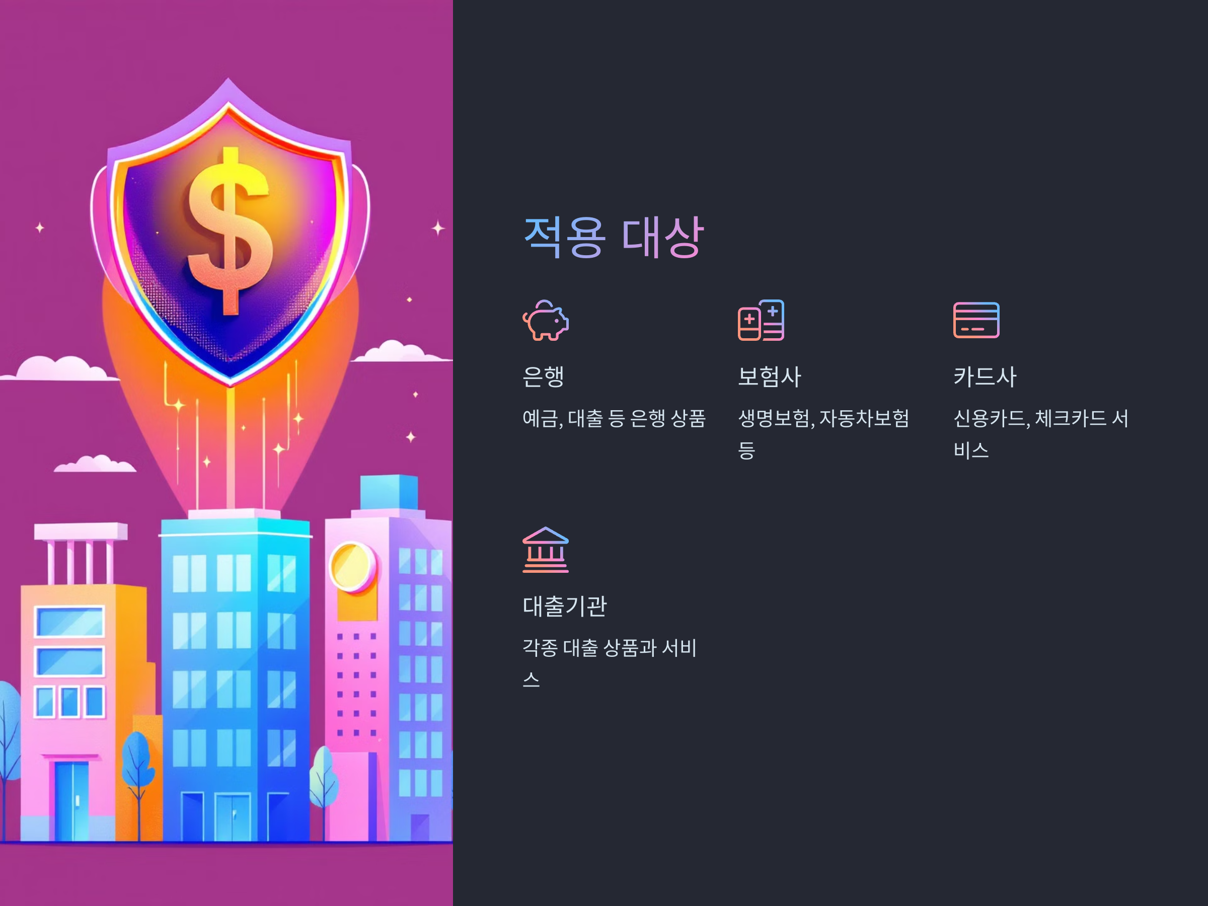 금융소비자 보호법은 은행, 보험, 카드사, 대출기관 등 다양한 금융기관에서 제공하는 금융 서비스에 모두 적용됩니다. 이 법의 적용을 받는 금융 상품은 예금, 대출, 보험, 카드 등 모든 금융 거래에 해당합니다. 또한, 금융상품의 계약을 체결할 때 소비자가 알지 못한 채 불리한 조건에 동의하는 일이 없도록, 모든 금융기관은 소비자에게 명확하고 공정한 정보를 제공해야 합니다.