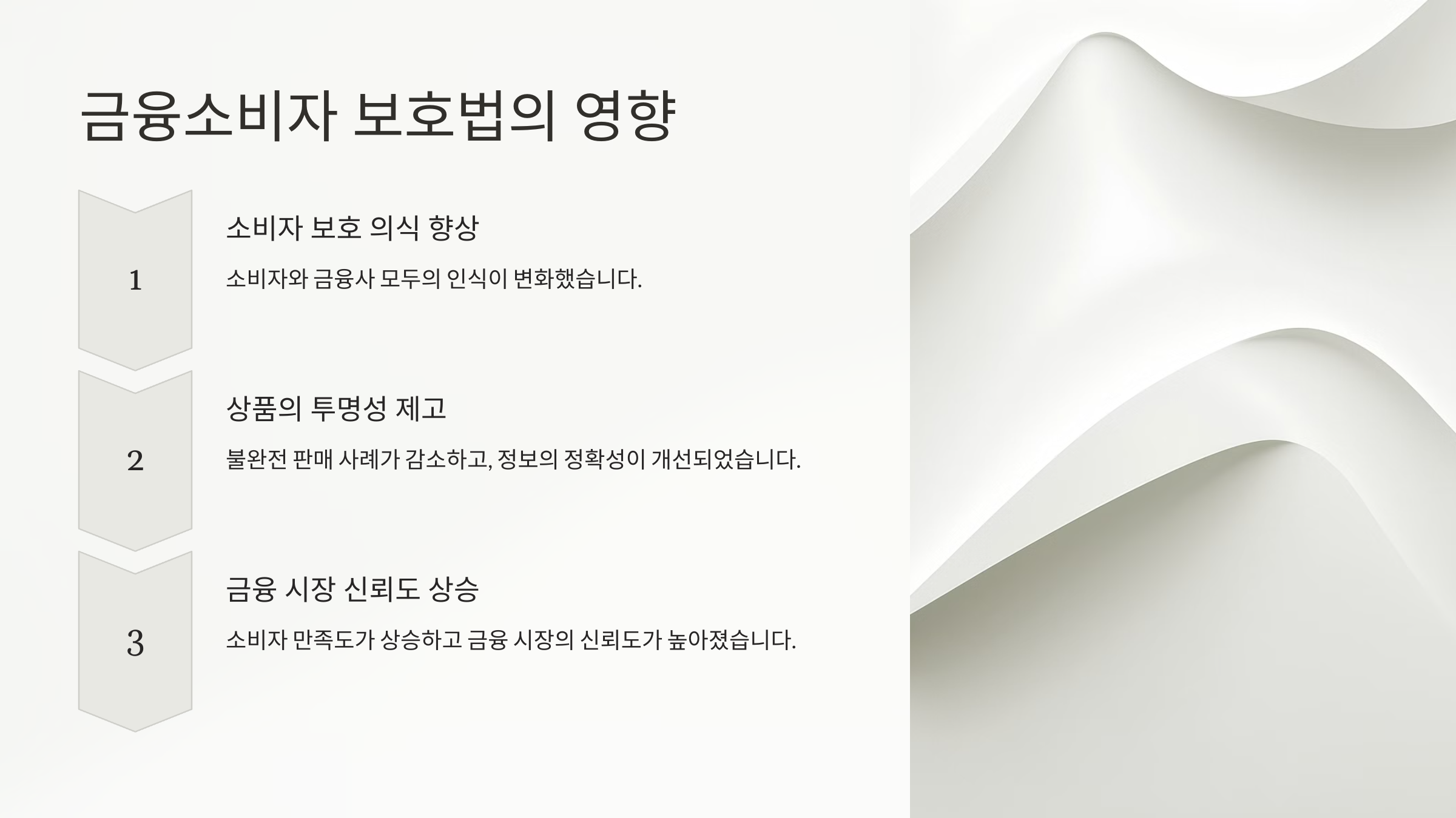 법 시행 이후 금융사와 소비자 모두의 인식이 변화했습니다. 소비자는 자신의 권리를 명확히 이해하게 되었고, 금융사는 법을 준수하기 위해 상품 개발과 판매 과정을 더욱 신중히 관리하고 있습니다.