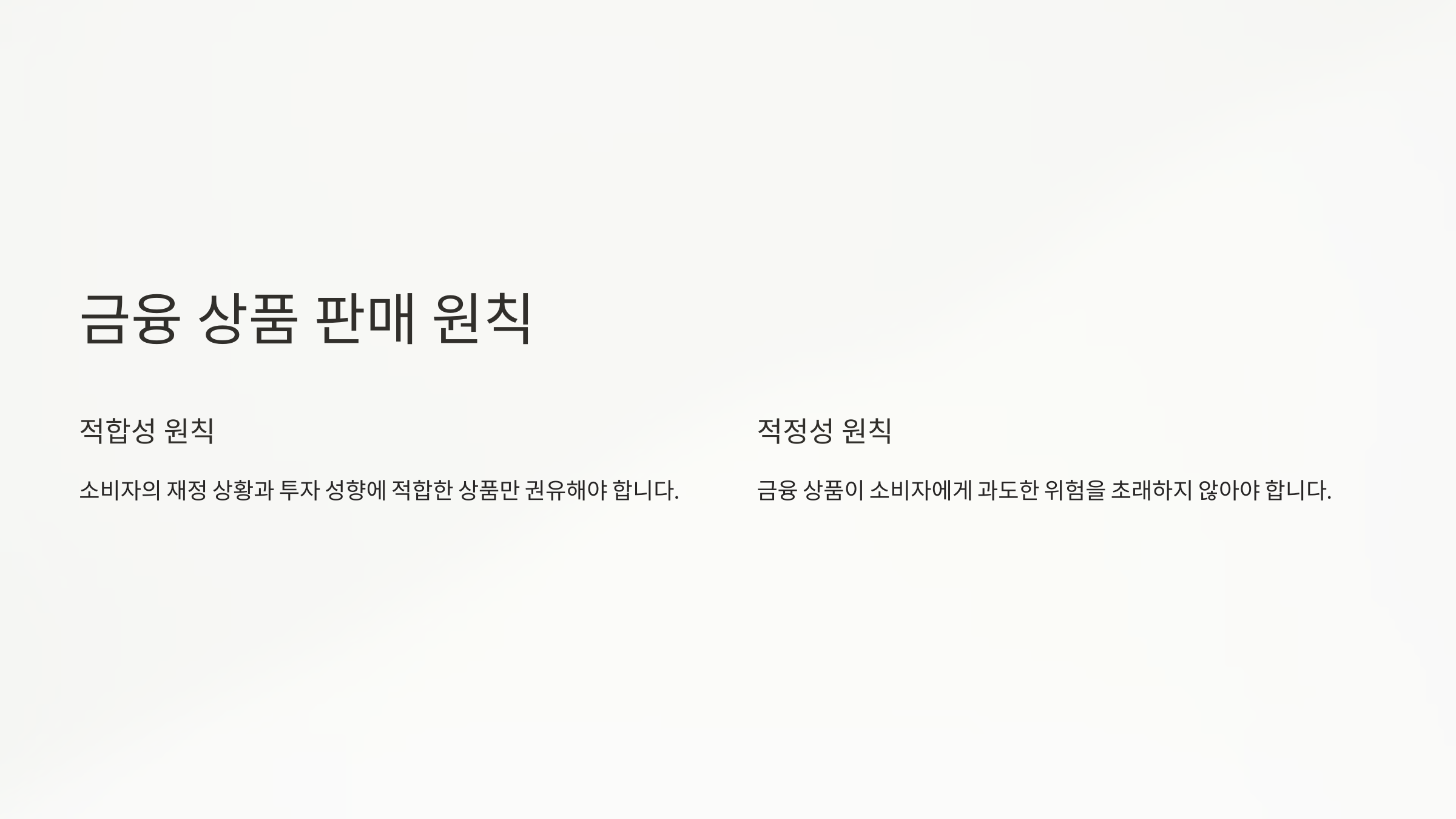 - 적정성 원칙: 금융 상품이 소비자에게 과도한 위험을 초래하지 않아야 합니다.