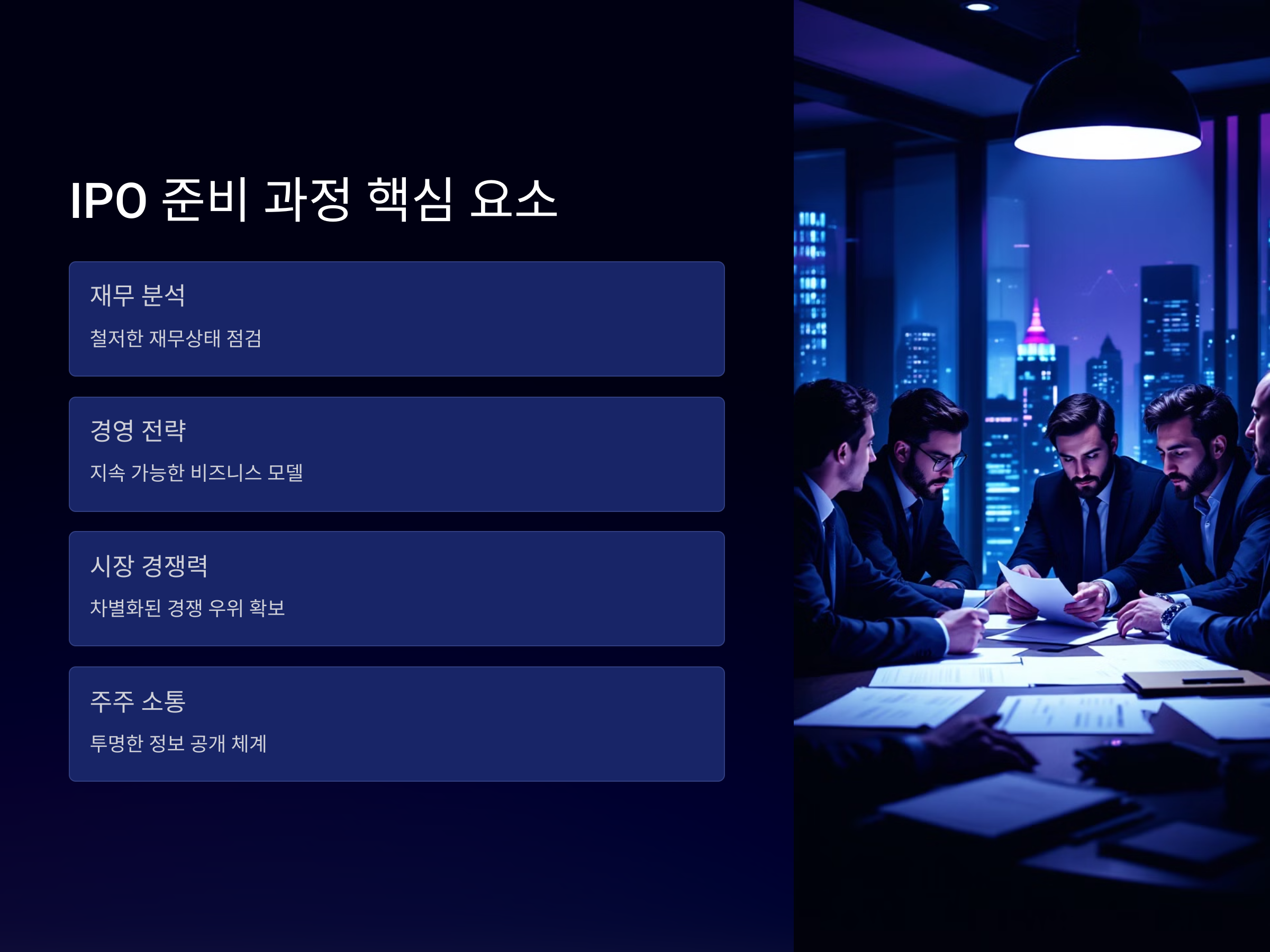 IPO 준비 과정에서 가장 중요한 것은 기업의 재무상태와 경영 전략을 철저히 분석하는 것입니다. 기업이 공개 상장 후 안정적인 성장을 이어가기 위해서는 투명한 재무 상황과 신뢰성 있는 경영이 필수적입니다.