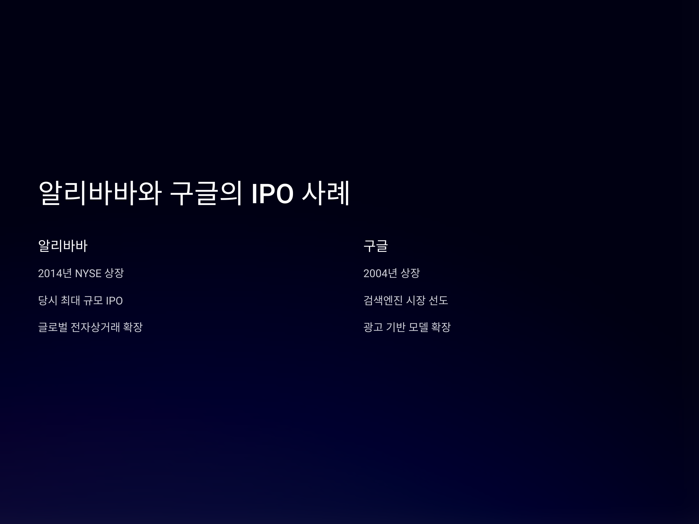 알리바바는 IPO 후, 중국을 넘어 글로벌 기업으로 자리잡으며, 해외 시장에서도 큰 성장을 이어갔습니다. 이를 통해 IPO가 기업 성장에 얼마나 중요한 역할을 하는지를 잘 보여줍니다.