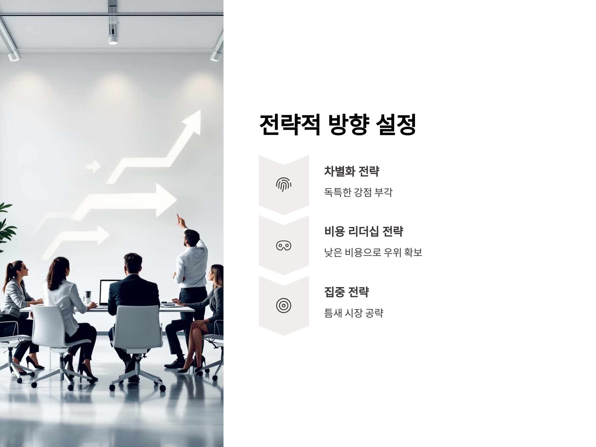 경쟁력 분석을 통해 얻은 정보를 바탕으로 기업은 전략적 방향을 설정할 수 있습니다. 각 분석 방법을 통해 도출된 결과는 기업이 경쟁 시장에서 차별화된 가치를 제공할 수 있도록 도와줍니다. 경쟁력 분석 후 기업이 취할 수 있는 전략적 방향은 다음과 같습니다.