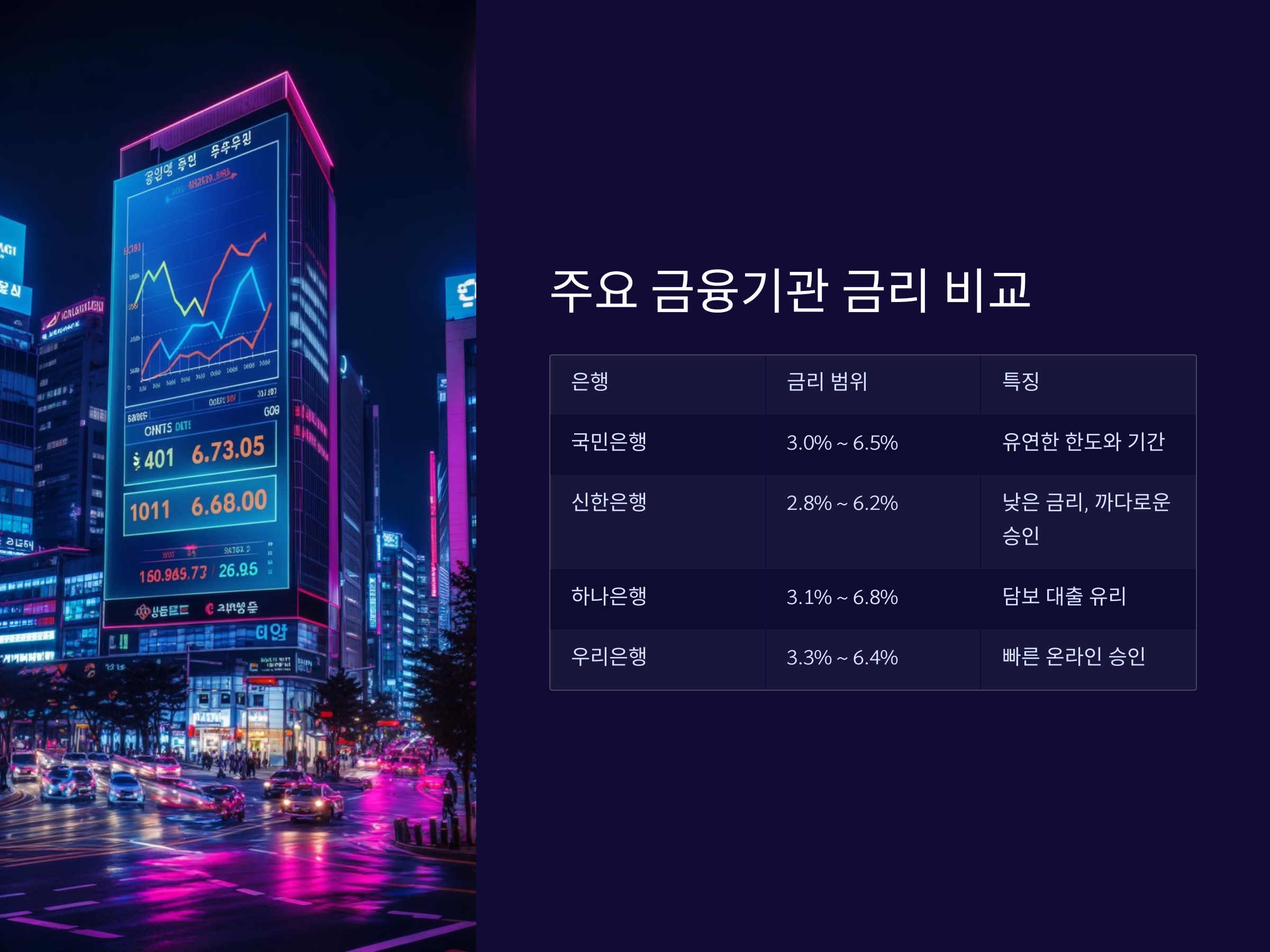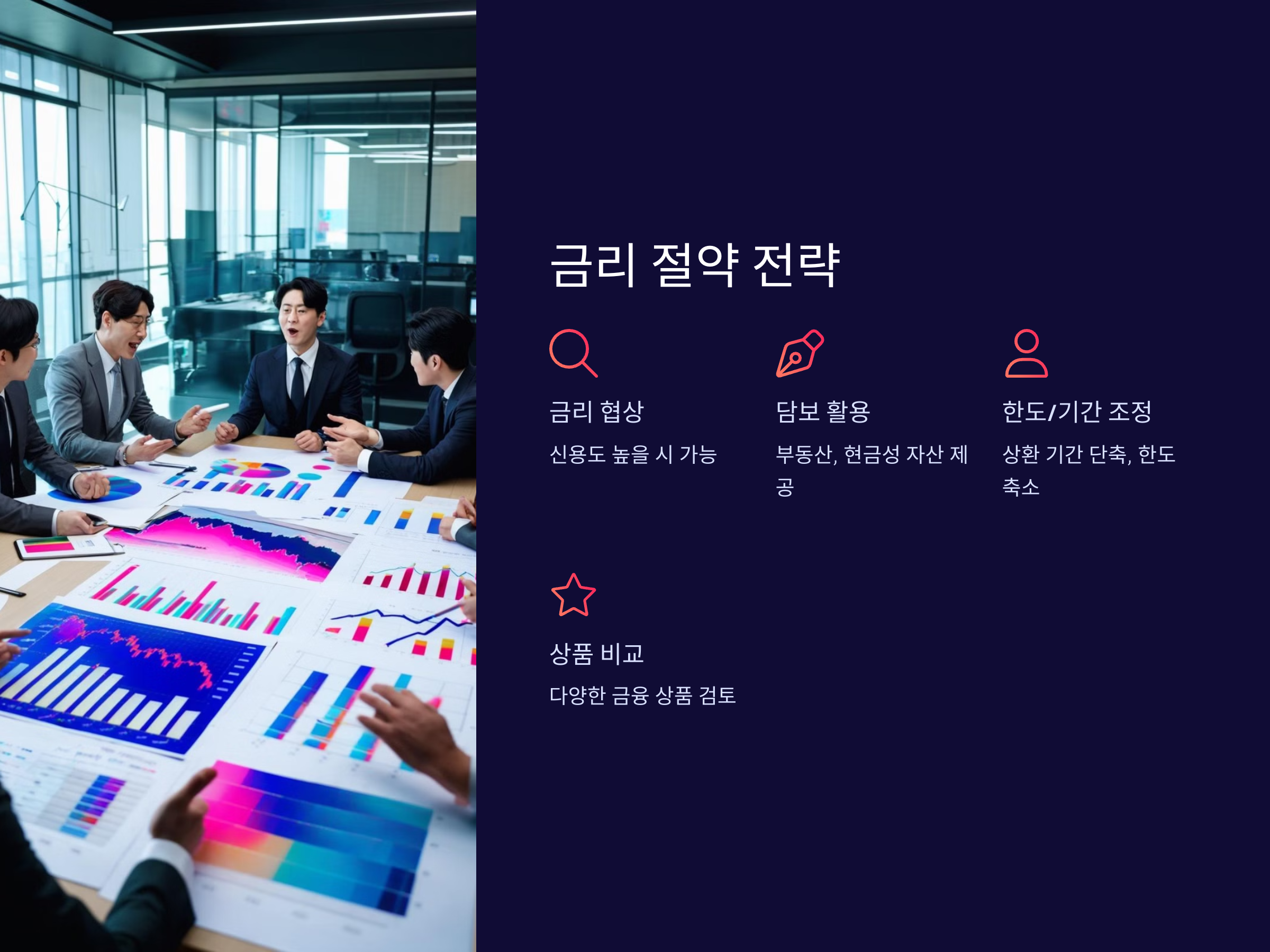 - 대출 조건: 금리가 낮다고 해서 무조건 유리한 것은 아닙니다. 대출 한도, 상환 기간, 추가 비용 등을 모두 고려해야 합니다.