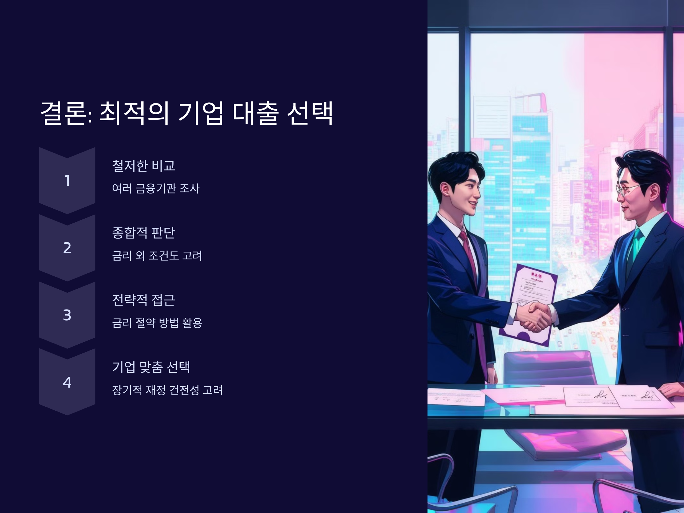 - 금리 협상: 대출을 신청하기 전에, 가능한 한 금리 협상을 시도해보세요. 기업의 신용도가 높거나 대출 규모가 클 경우, 금리를 낮출 수 있는 가능성이 있습니다.
