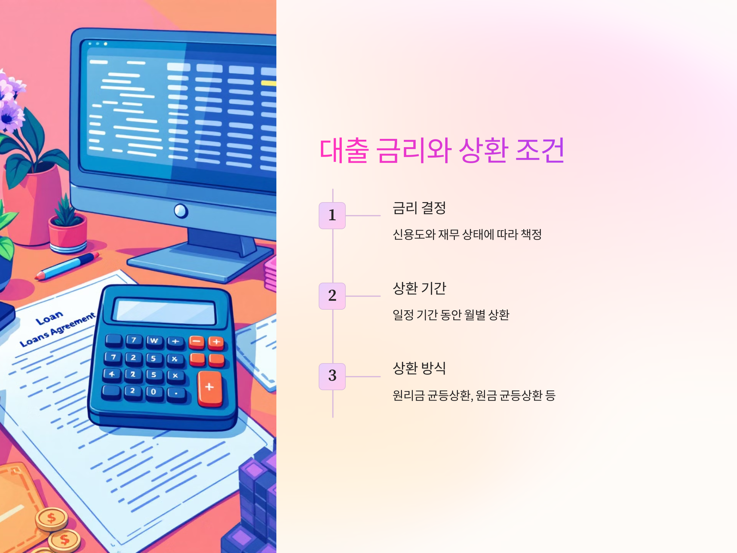 대출 상환 조건 또한 중요한 요소입니다. 대부분의 기업 대출은 일정한 상환 기간을 두고 월별 상환을 하게 되며, 상환 방식(원리금 균등상환, 원금 균등상환 등)에 따라서도 상환 금액이 달라집니다. 이 부분을 충분히 이해하고 대출을 신청해야 합니다.