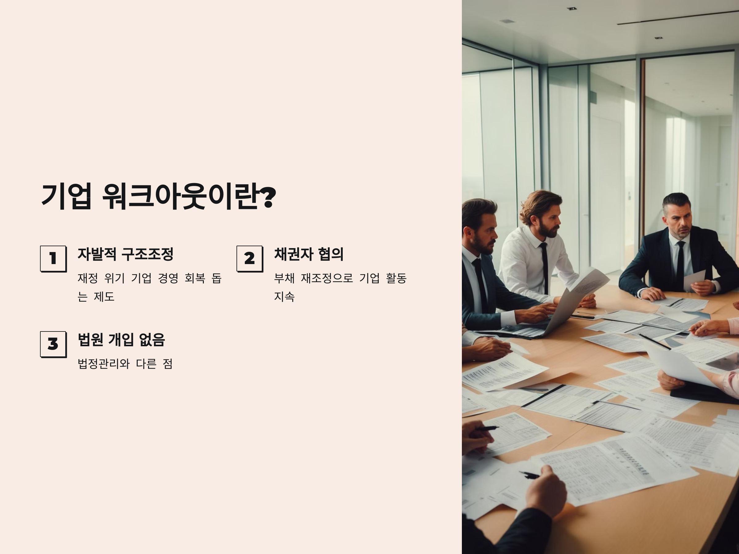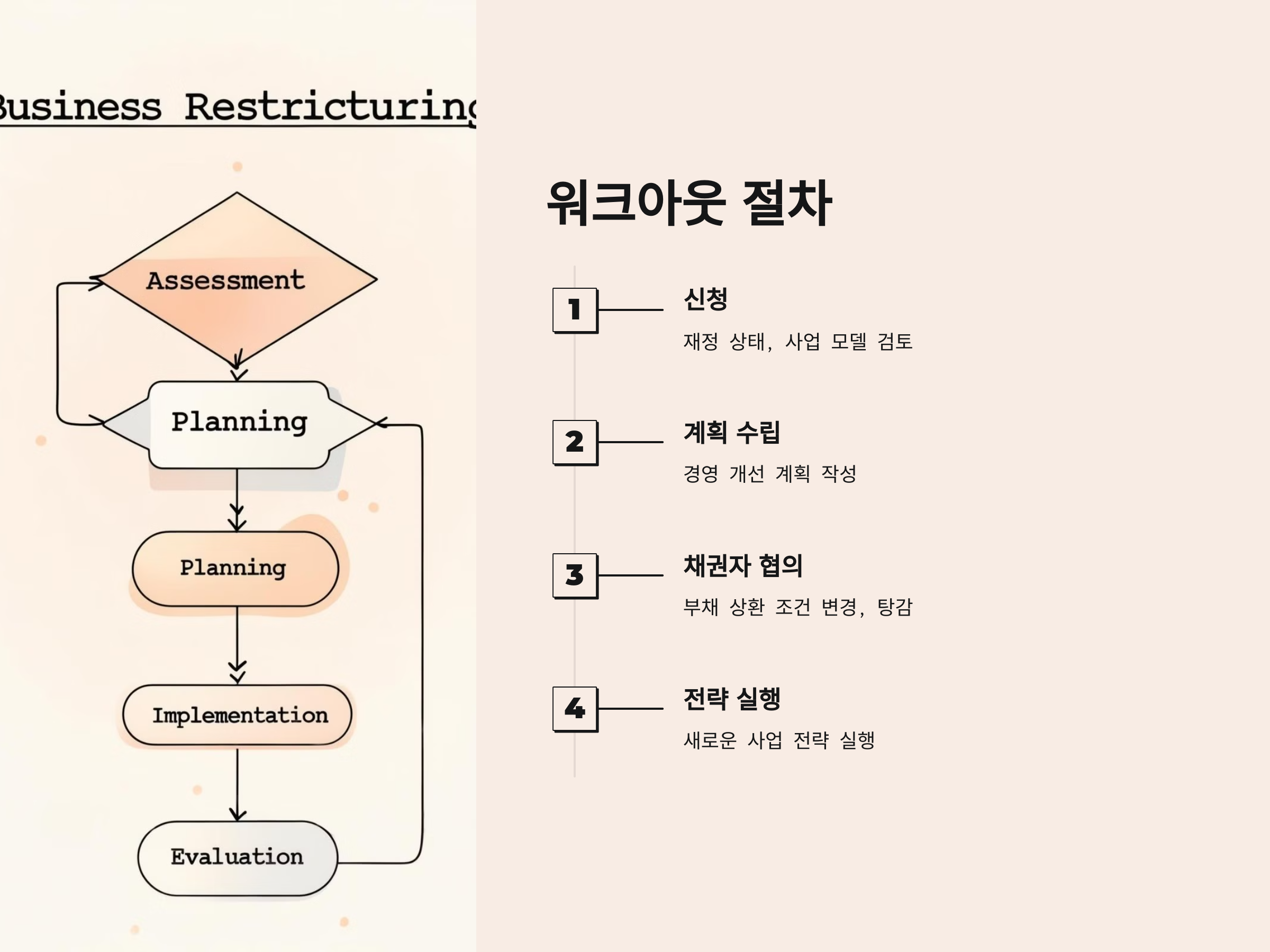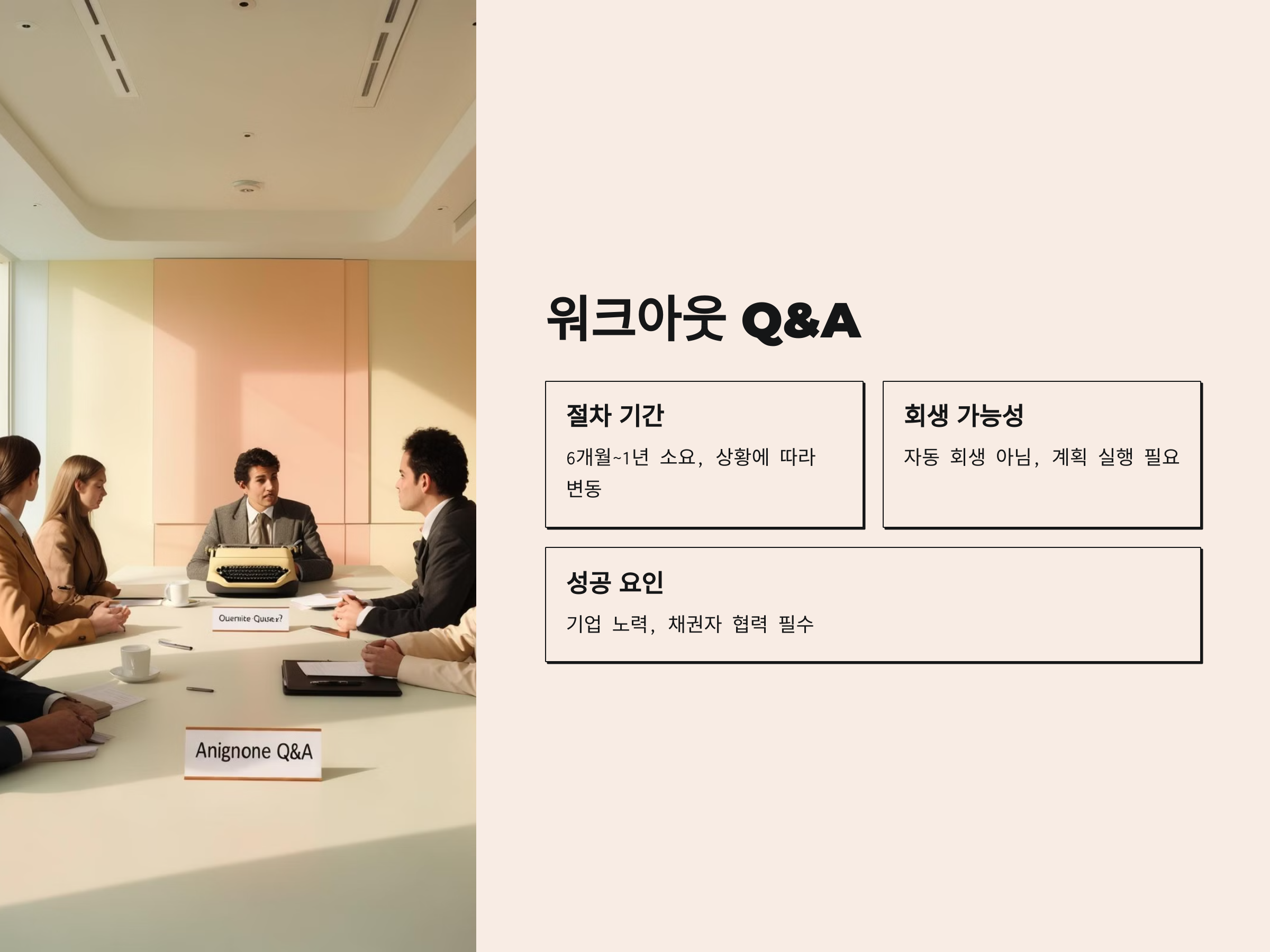 - 시간 확보: 워크아웃을 통해 기업은 회생을 위한 충분한 시간을 확보할 수 있습니다.