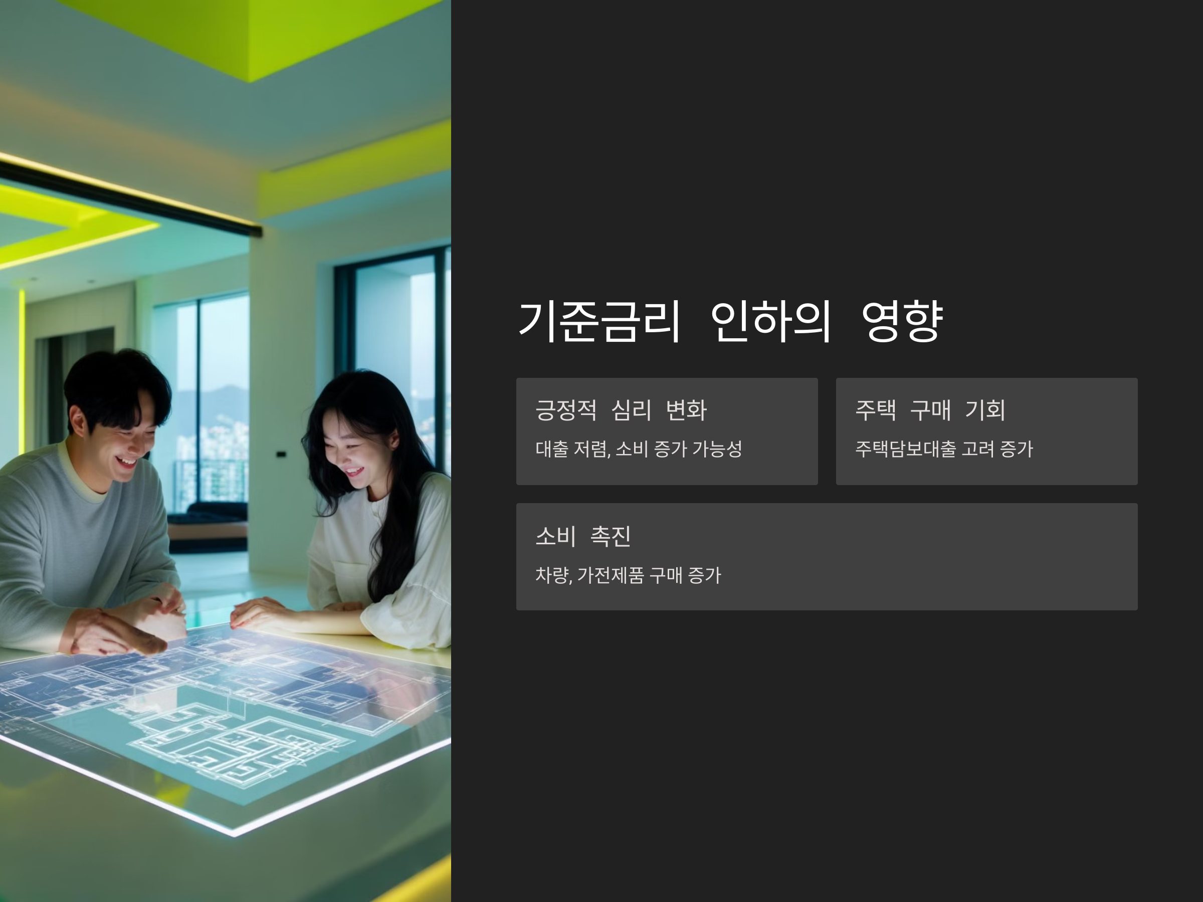 반대로 기준금리가 인하되면 소비자들의 심리는 긍정적인 방향으로 변화할 수 있습니다. 낮은 금리는 대출을 더 저렴하게 만들고, 소비자들은 더 많은 자금을 소비에 쓸 수 있게 됩니다. 특히 주택담보대출이나 신용대출을 고려하는 소비자들에게 금리 인하는 큰 유인 요소로 작용합니다.