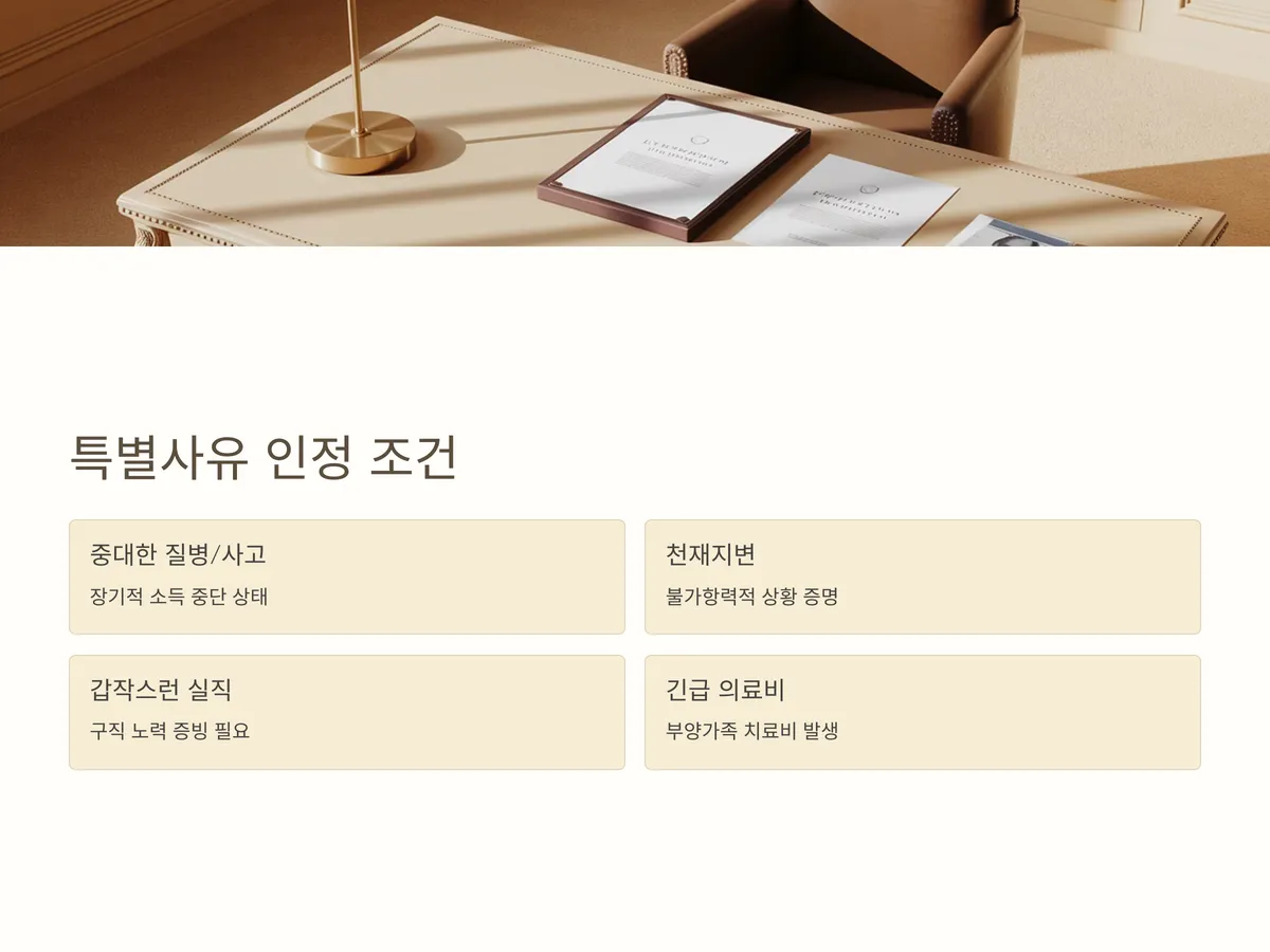 법원이 인정하는 특별사유는 일반적으로 아래와 같은 경우입니다: 중대한 질병이나 사고로 인한 소득 중단, 천재지변, 갑작스런 실직, 부양가족의 긴급한 의료비 등입니다. 특히 이러한 사유는 문서로 명확히 입증되어야 하며, 일회성이 아닌 장기적 수입 불능 상태임을 보여줘야 합니다.