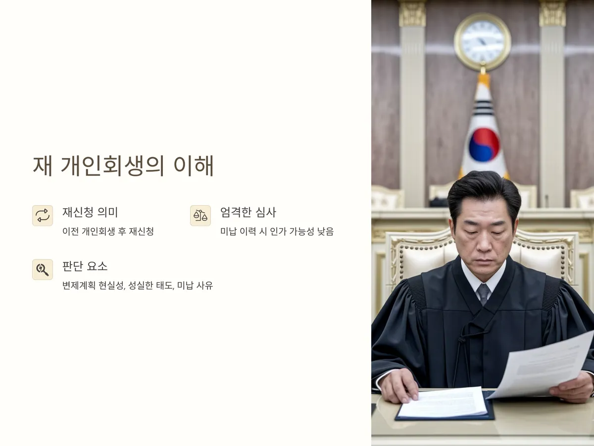 재 개인회생은 이미 개인회생을 한 차례 이용한 사람이 다시 채무불이행 상태에 빠져 새로운 회생 절차를 신청하는 것을 의미합니다. 처음 신청과 달리 '재신청'은 법원이 더욱 엄격히 심사하며, 특히 변제금 미납 이력이 있거나 기존 회생 절차에서 면책을 받은 후 일정 기간 내에 재신청할 경우엔 인가 가능성이 낮아집니다.